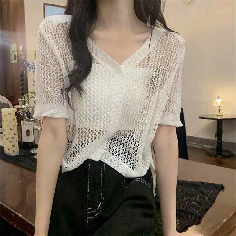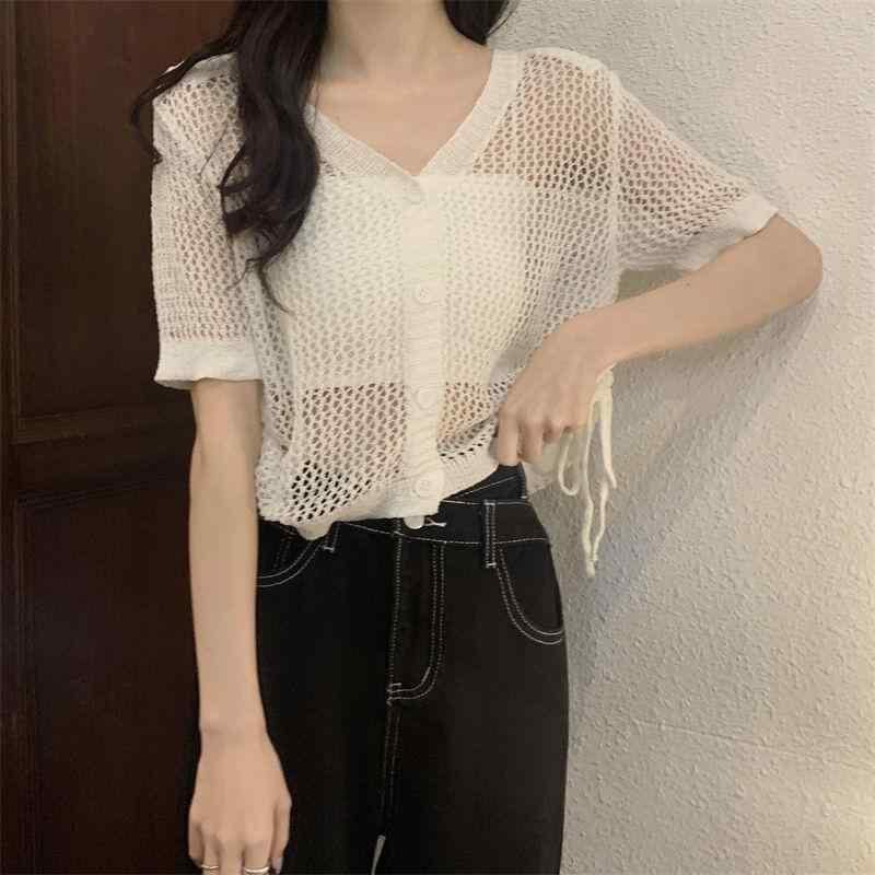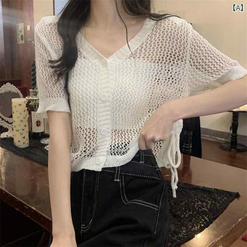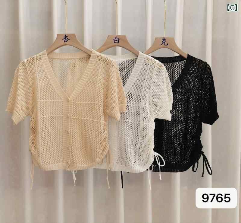 ニット レディース 半袖 Vネック ショート丈 ドローストリング 透かし編み 接触冷感 UVカット ポリエステル スパンデックス素材 個性的 デザイン 3D柄 白 黒 カジュアルスタイル