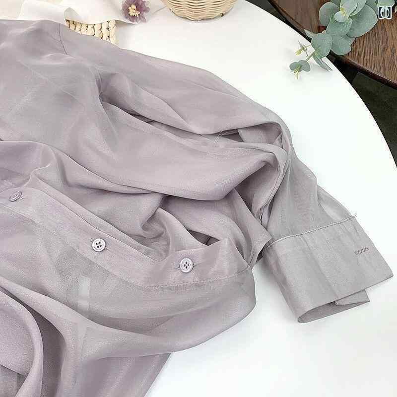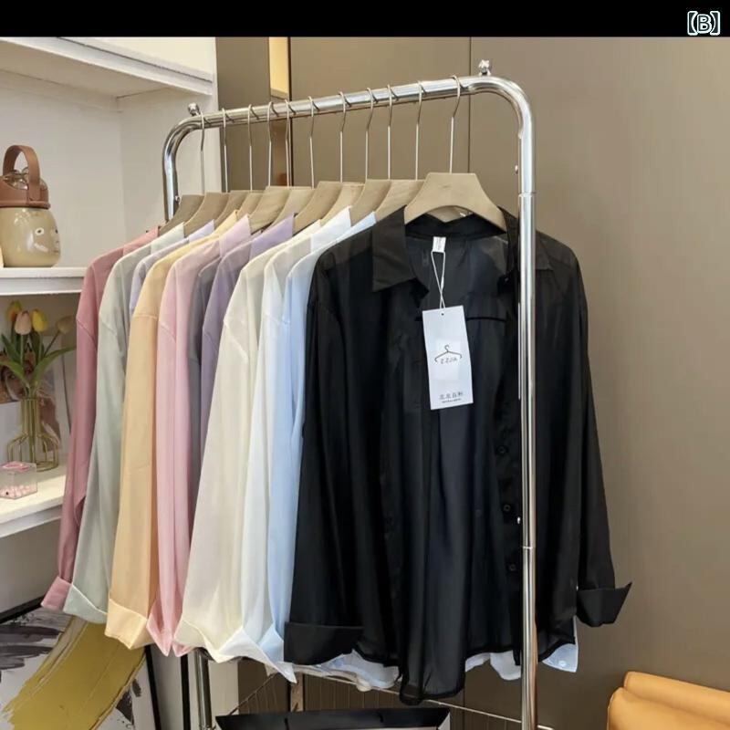 シャツ レディース パールシフォン UVカット 長袖 薄手 ポリエステル ポロ襟 フリル袖 シアー素材 高級感 上品 エレガント スイート フェミニン 韓国風 ブラウス
