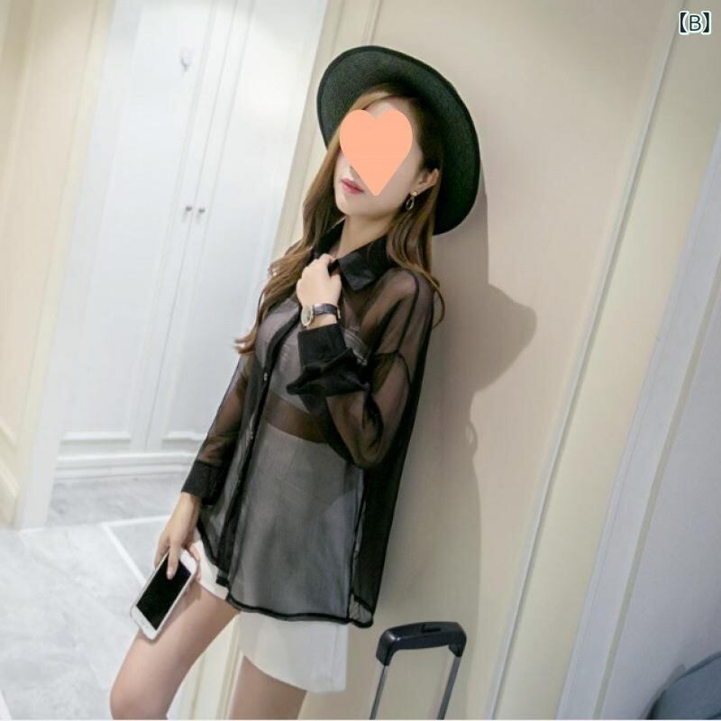 ブラウス レディース シフォン オーガンジー シアー 長袖 ポロ襟 フリル袖 薄手 UVカット 接触冷感 ポリエステル きれいめ 通勤 オフィススタイル タウンユース フェミニン ホワイト ブラック