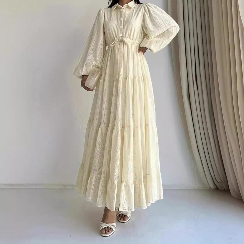 ワンピース レディース 中東 ムスリム アラビアン レース 襟付き 長袖 ロング丈 マキシ丈 ハイウエスト ベルト付き ポリエステル 無地 エレガント 上品 通勤 オフィス カジュアル フォーマル パーティー アプリコット ベージュ系