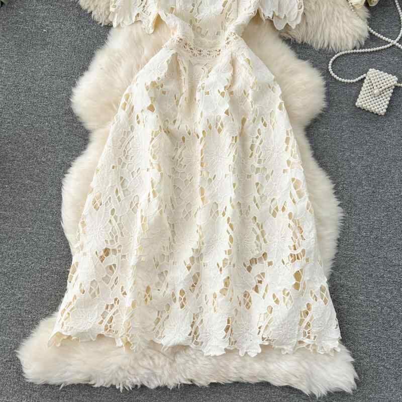 ワンピース レディース 春夏秋 エレガント 上品 花柄 レース カットワーク Aライン ミモレ丈 半袖 ハイウエスト ポリエステル フォーマル パーティー リゾート お呼ばれ 湖水色 ブラック アプリコット