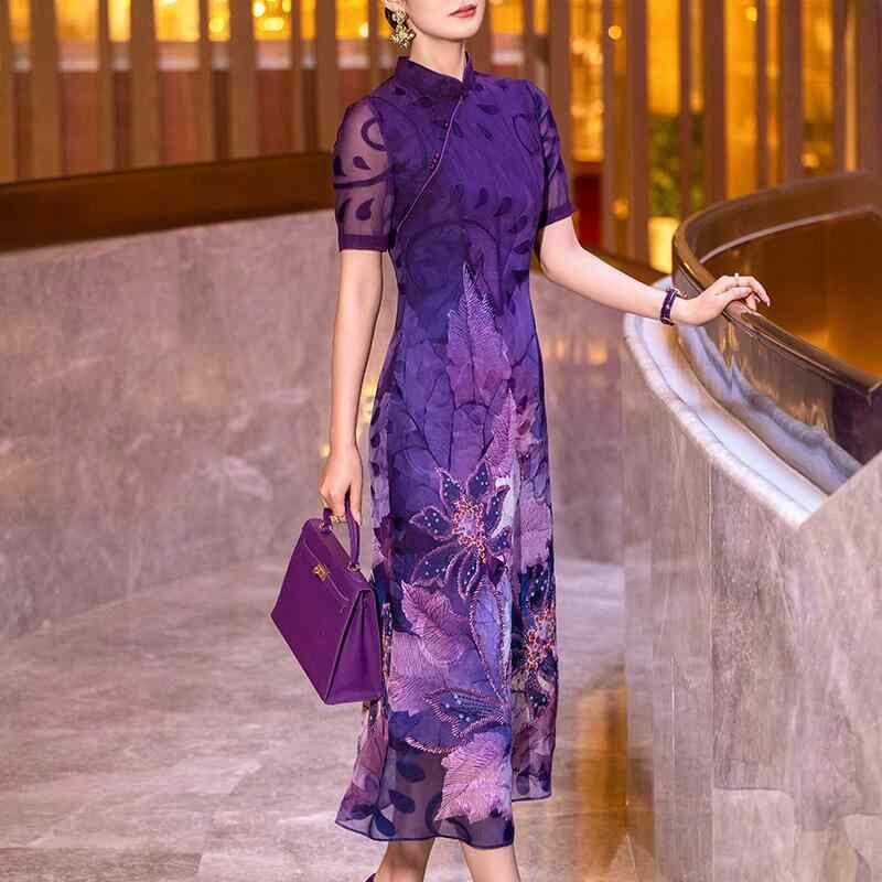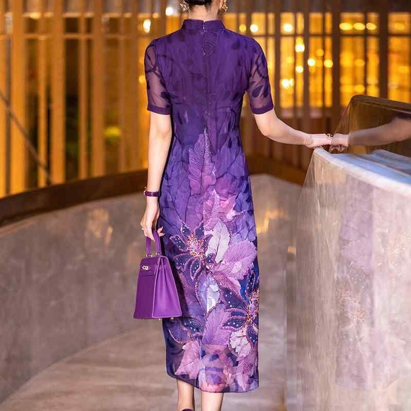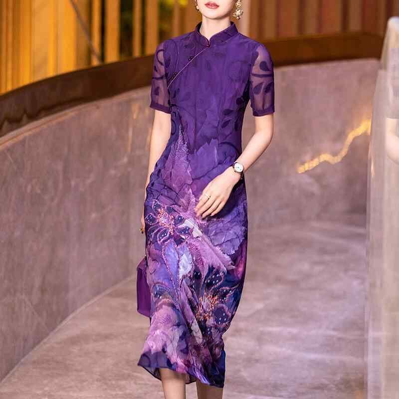 ワンピース 新中華風 改良チャイナドレス Aライン 花柄プリント スタンドカラー 半袖 ミディ丈 エレガント 上品 パープル レトロ 洗練された ポリエステル お呼ばれ 普段使い