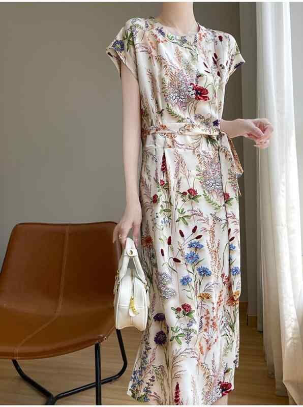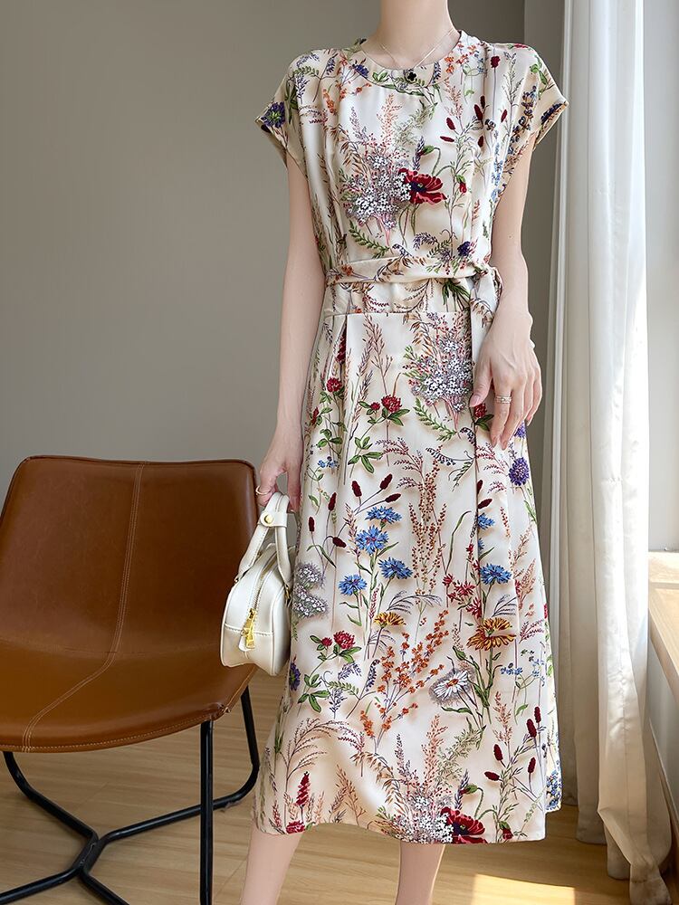 ワンピース 中華風 スタンドカラー ミディ丈 半袖 花柄 サテン調 ドレープ感 アセテート素材 エレガント 細見え Aライン ハイウエスト プルオーバー フリル袖 レトロクラシック 着回し カジュアル