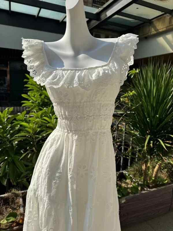 ワンピース レディース フレンチ ロマンティック レース 刺繍 綿 Uネック ノースリーブ ロング丈 リゾート エレガント 上品 ホワイト