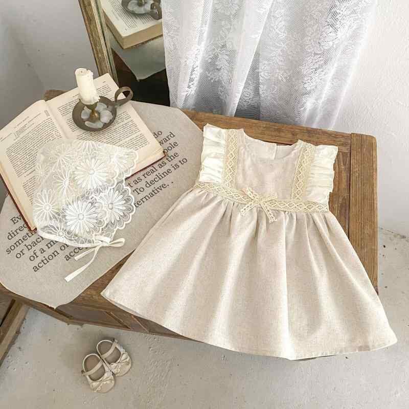 ワンピース 女の子 ベビー バイカラー フリル袖 プリンセスドレス 綿麻混紡 Aラインシルエット 韓国風 かわいい スウィートカジュアル 幼児服 お出かけ着 アプリコット