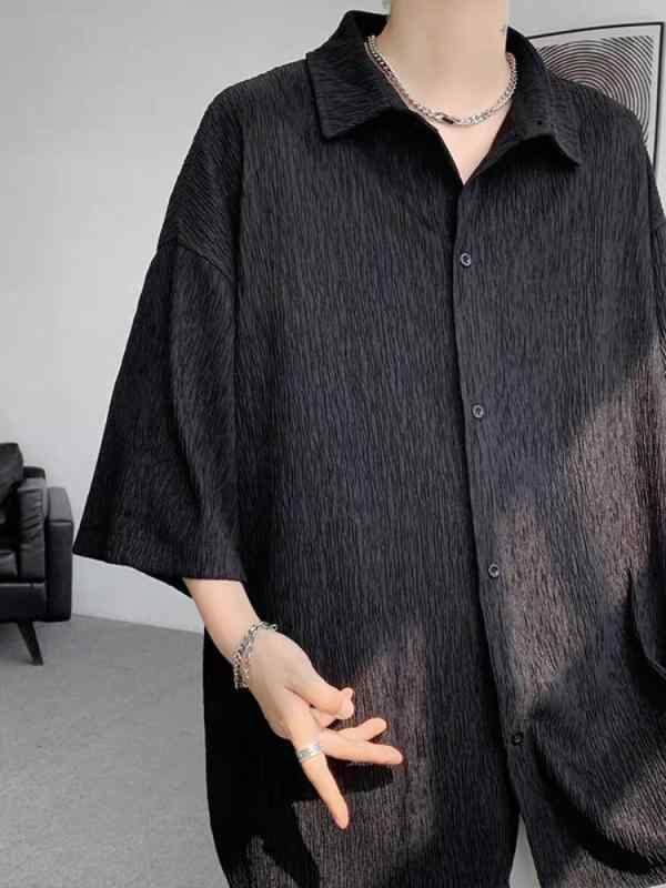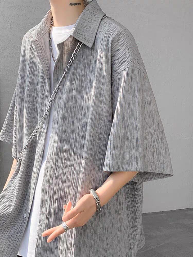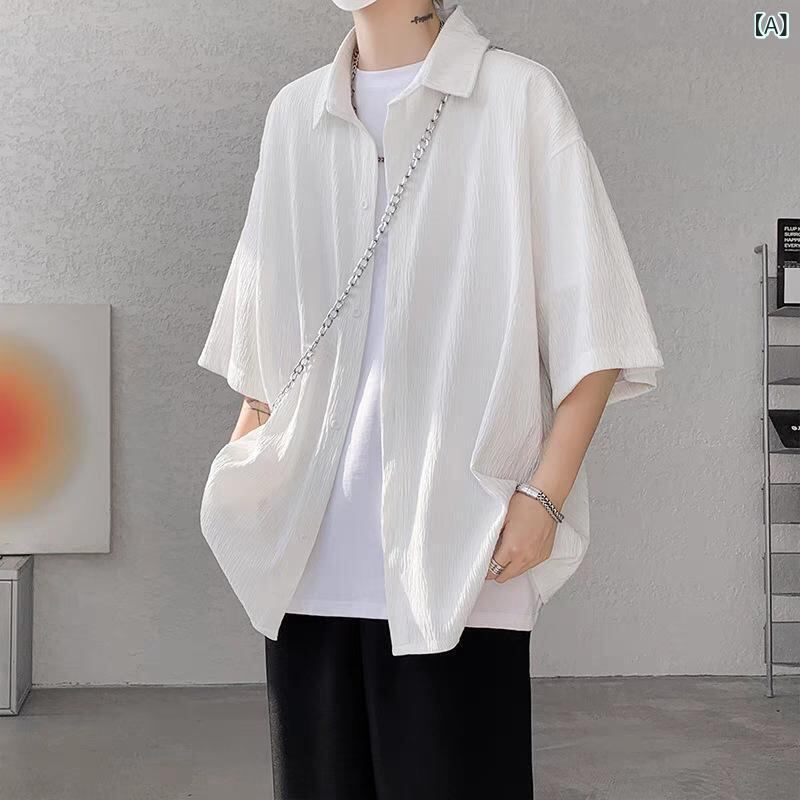 シャツ メンズ オーバーサイズ ビッグシルエット 五分袖 テクスチャー感 立体感 高級感 ポリエステル 防シワ アイロン不要 襟付き 大人カジュアル リラックススタイル 春 夏 秋 羽織り ホワイト ブラック グレー