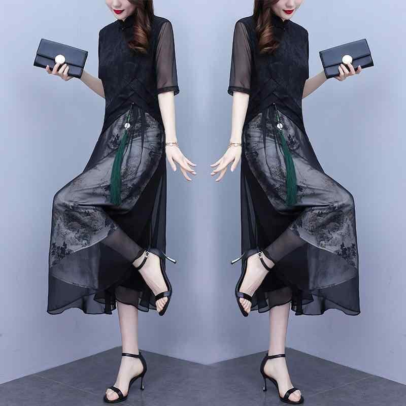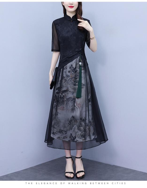 ロングワンピース レディース 大きいサイズ 夏 改良チャイナドレス スタンドカラー シフォン レトロ 普段使い 半袖 ハイウエスト フリル裾 花柄プリント きれいめ 上品 ポリエステル素材 通勤スタイル