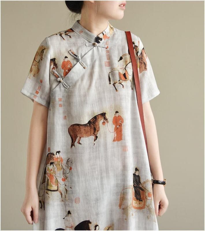 ワンピース レディース 文芸レトロ クラシカル 改良チャイナドレス チャイナボタン 綿麻 コットンリネン 長袖 ゆったり 大きいサイズ プラスサイズ ミモレ丈 Aライン スタンドカラー パッチワーク ボヘミアン 普段使い