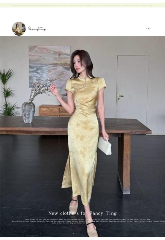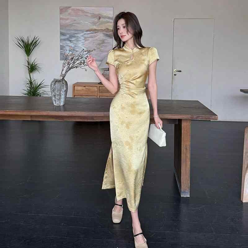 ワンピース レディース 改良チャイナドレス風 サテン生地 バタフライ柄 スリット タイトスカート ハイウエスト 半袖 スタンドカラー プリーツ 切り替え 上品 エレガント 通勤 ミディ丈 マスタードイエロー
