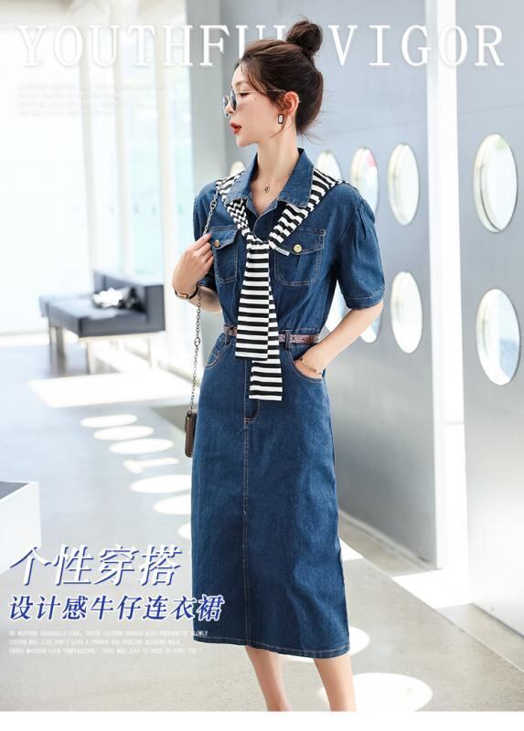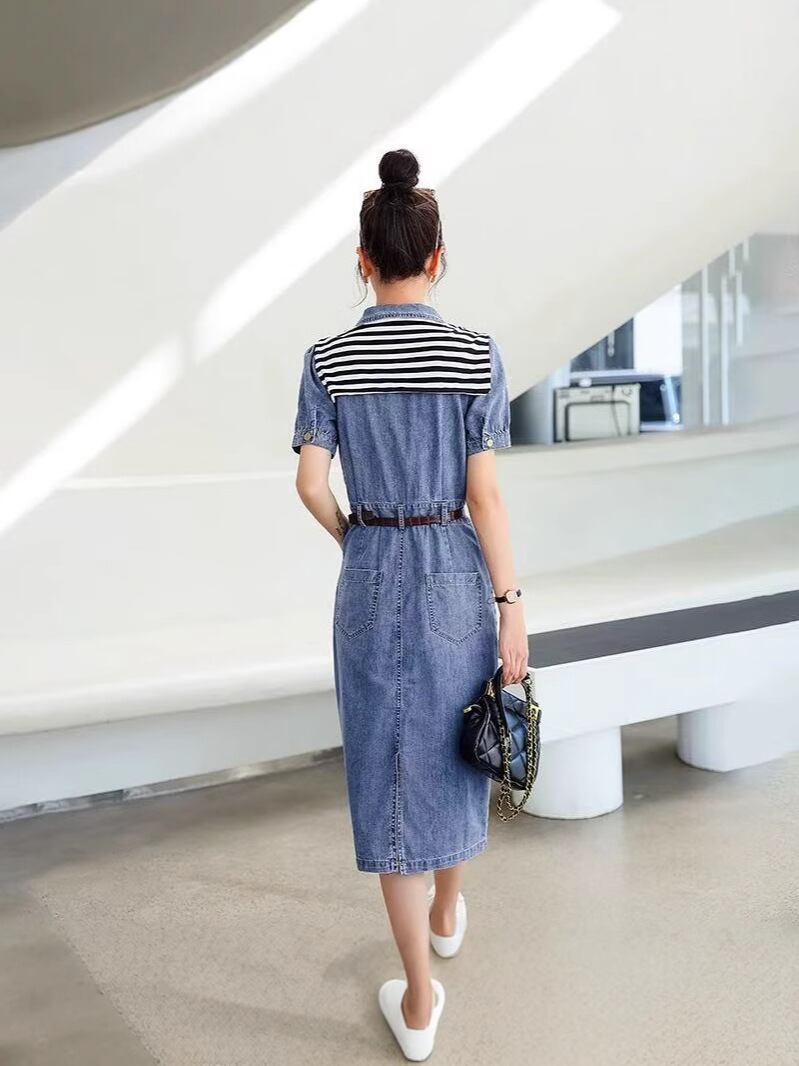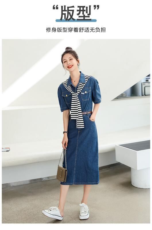 ワンピース レディース デニムワンピース デニム風 Aラインワンピース 襟付き 短袖 ミドル丈 カジュアル エレガント 通勤 きれいめ おしゃれ ファッション 合わせやすい