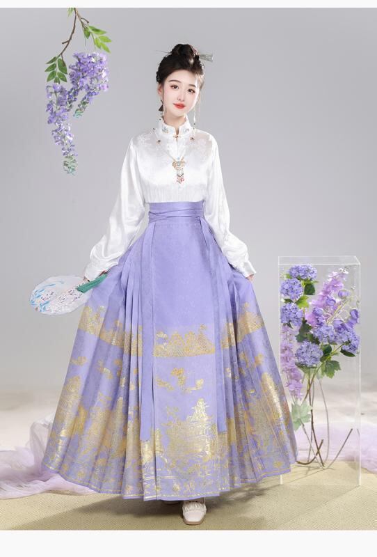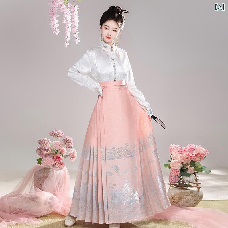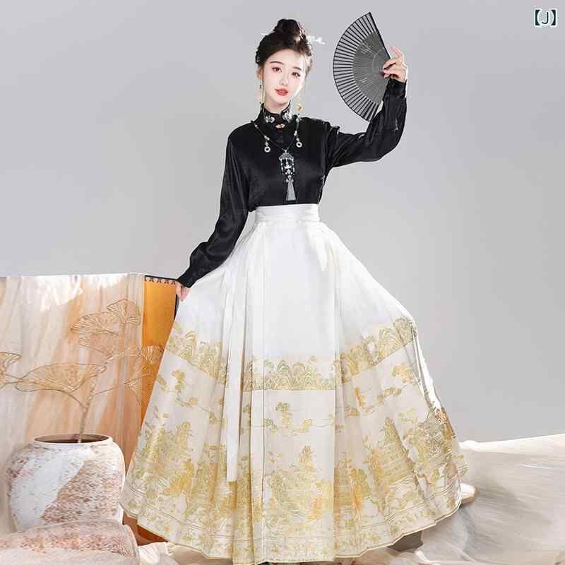 馬面スカート レディース 漢服 金銀糸織り 螺鈿柄 提花刺繍 新中華スタイル ポリエステル オールシーズン 風景柄 プリーツ加工 日常使い 通勤 オフィス