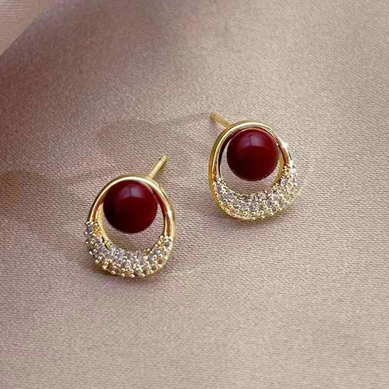 ピアス レディース レッド パール ラインストーン スタッドピアス 幾何学型 ラウンド型 小ぶり 繊細 ユニークデザイン シンプル 上品 高級感 韓国風 フェミニン 金属製 デイリーユース