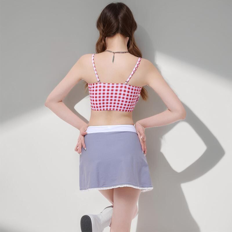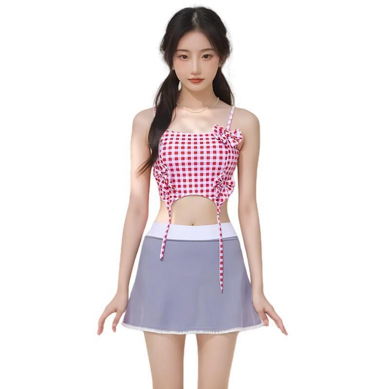 水着 レディース セパレート 体型カバー 着痩せ 小胸 バストアップ 胸パッド付き ノンワイヤー チェック柄 スカートタイプ 2点セット ポリエステル 再生繊維 レッド プール ビーチ 海水浴 リゾート マリンスポーツ