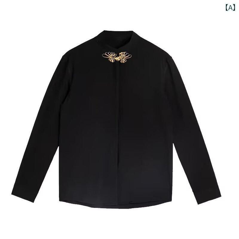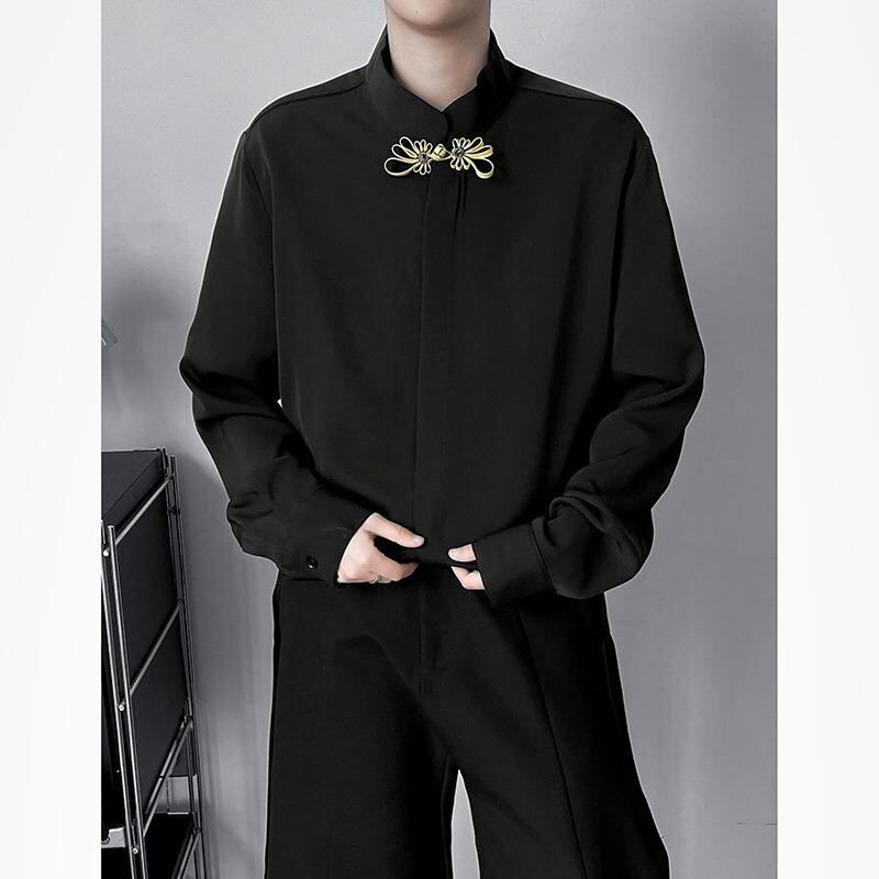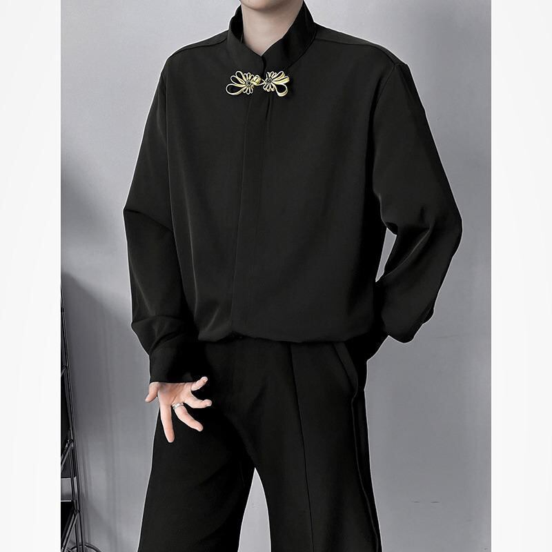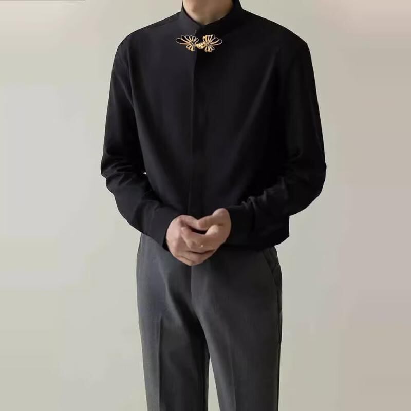 シャツ メンズ 中式 チャイナボタン フォーマル 礼服 結婚式 披露宴 新郎 卒業式 入学式 成人式 パーティー 普段使い スタンドカラー 長袖 ポリエステル ゆったり ブラック