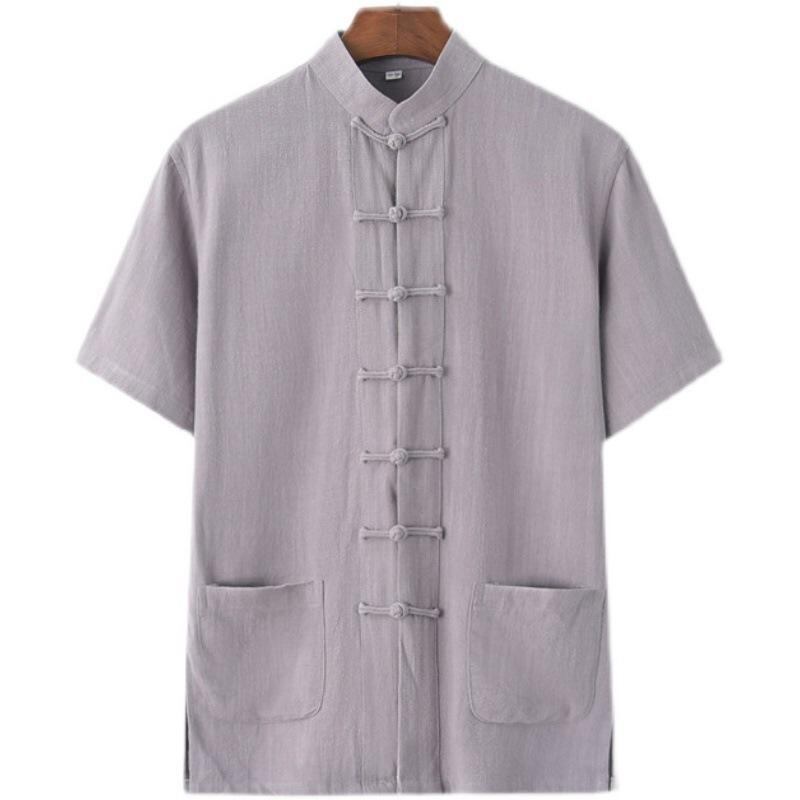 シャツ メンズ 麻混紡 チャイナ風 半袖 スタンドカラー 前開き ゆったり リラックスフィット 大きいサイズ 太極拳ウェア カジュアル 普段使い ノーアイロン ミドルエイジ向け 無地