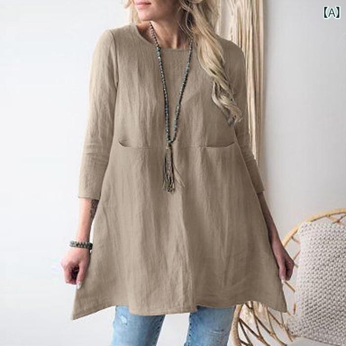 ワンピース レディース ゆったり ラウンドネック 七分袖 綿麻 コットンリネン 無地 ミディ丈 アシンメトリーヘム イージーケア カジュアル デイリーユース