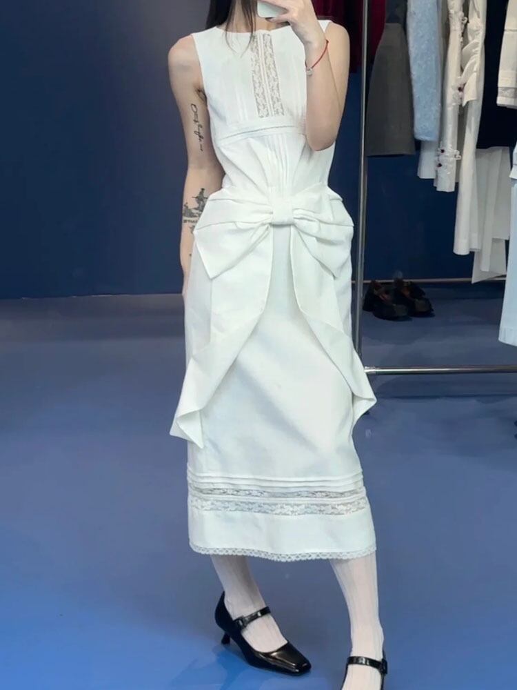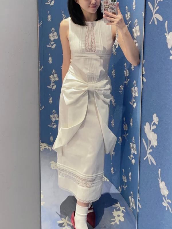 ワンピース 女の子 ノースリーブ ラウンドネック 超ビッグ 立体 リボン ミディ丈 綿麻素材 レース装飾 ガーリー スウィート フェミニン ホワイト ダークブルー