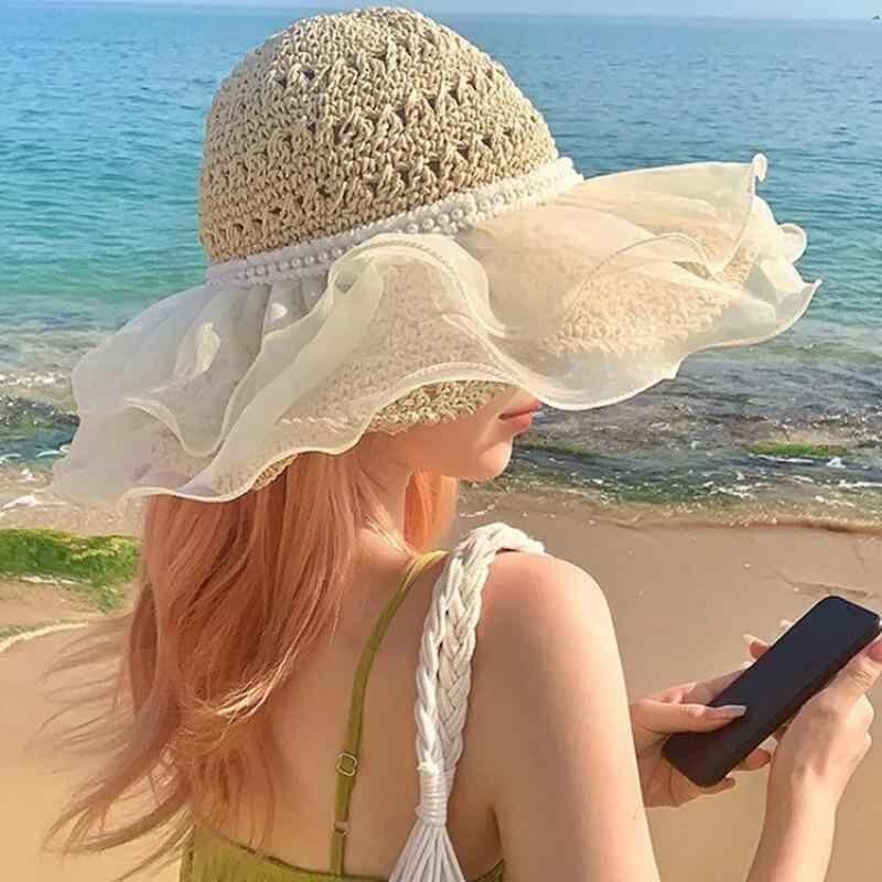 麦わら帽子 レディース 蝶結び レース 折りたたみ式 夏用 UVカット 日よけ つば広 透かし編み かぎ針編み 通気性 リゾート かわいい エレガント ペーパーブレードハット