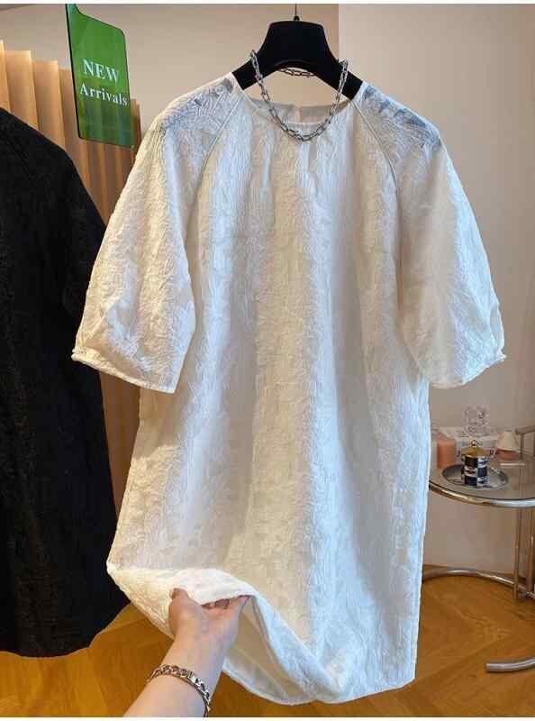 ワンピース レディース ゆったり 高級感 新中華風 ジャガード織り 立体柄 パフスリーブ 五分袖 クルーネック Iライン ミディ丈 通勤 ポリエステル ブラック ベージュ