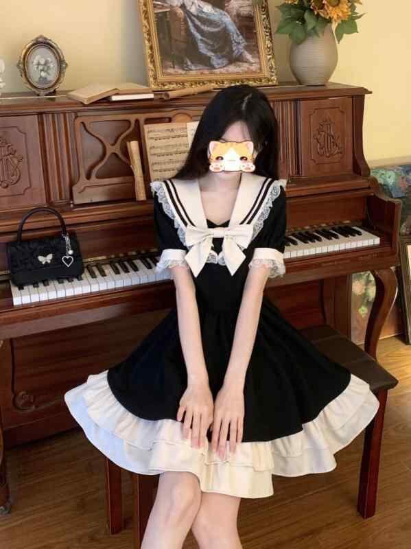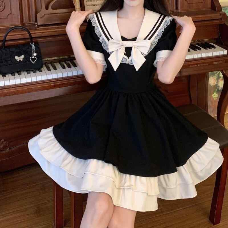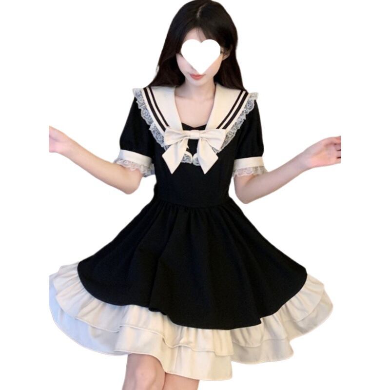 ワンピース レディース セーラー襟 ロリータ 学院風 かわいい 若見え 夏 ティアード ウエストマーク 細見え 半袖 ショート丈 パッチワーク リボン 黒 ポリエステル