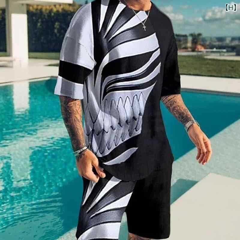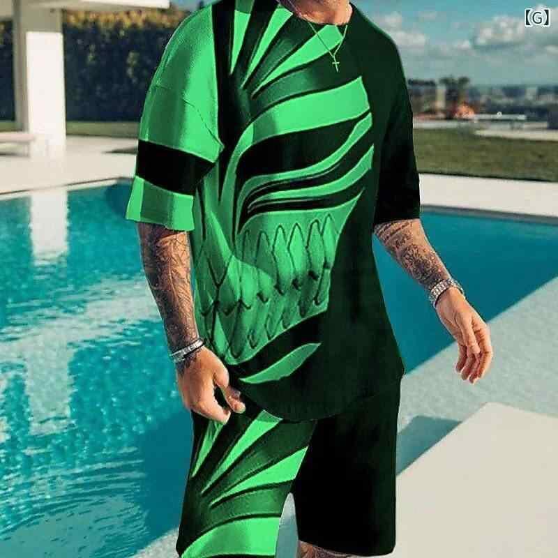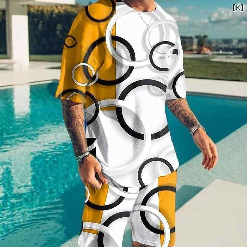 メンズ カジュアルウェア セットアップ Tシャツ ハーフパンツ 2点セット クルーネック 丸首 3Dカラーブロック 立体配色 普段使い デイリー ストリート ファッション ポリエステル 速乾 通気性 軽量 春夏 サマーウェア