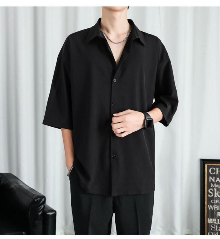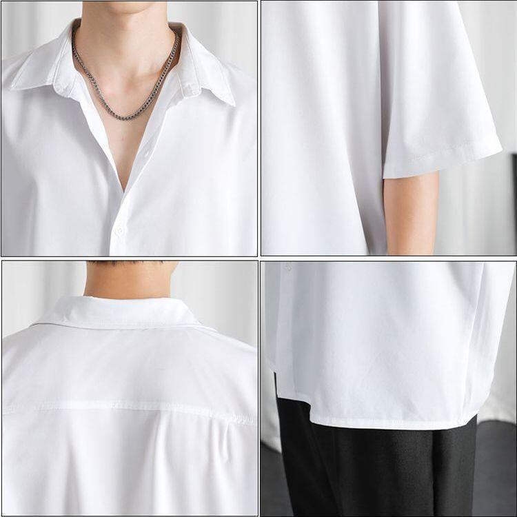 シャツ メンズ 男性用 夏 接触冷感 薄手 ポリエステル繊維 ゆったり ビッグシルエット カジュアル 5分袖 半袖 高級感 ドレープ感 スクエアカラー 日常使い ブラック グレー ホワイト