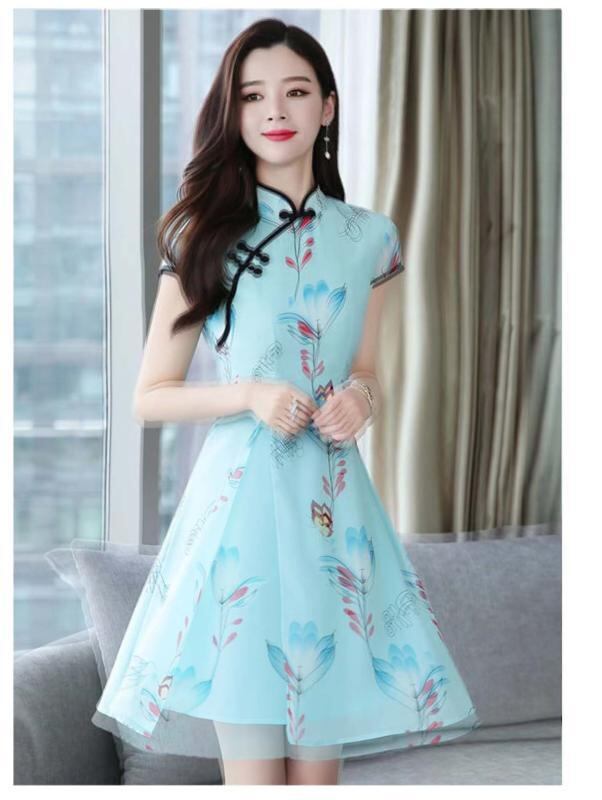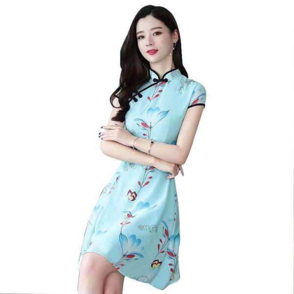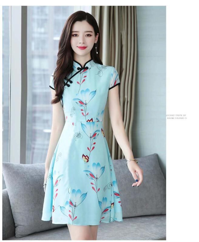 ワンピース レディース 夏 レトロ チャイナ風 プリント エレガント 中国風 スリムフィット 着痩せ 風 花柄 シフォン 薄手 ロング丈