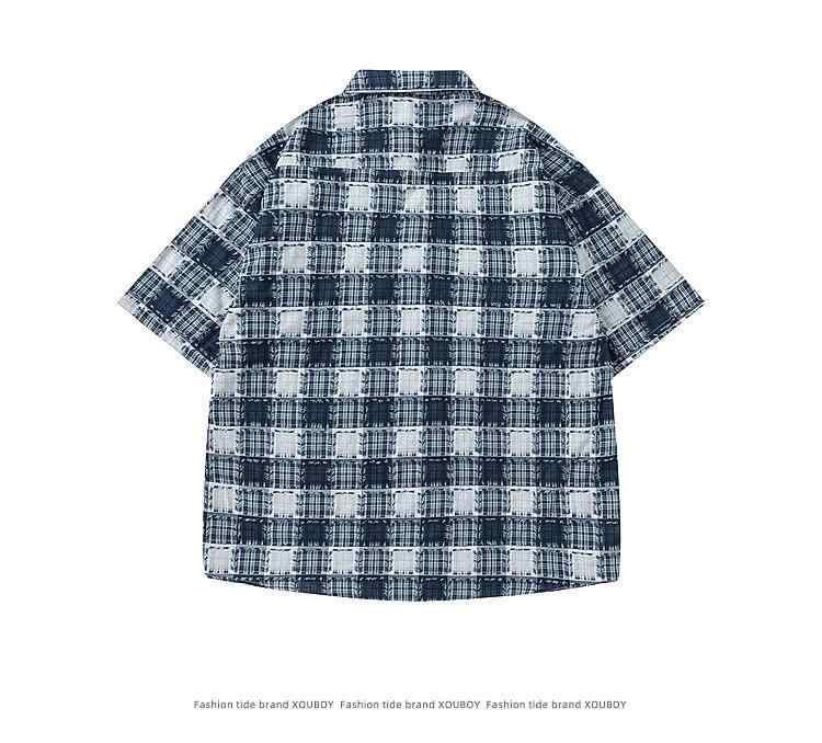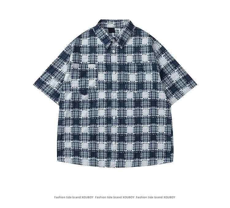 シャツ メンズ 半袖 格子柄 グリーン ブルー レトロ カジュアル ゆったりシルエット フリンジ 切りっぱなし コットン素材 起毛加工 デイリーユース ストリートスタイル 普段使い 色落ちしにくい