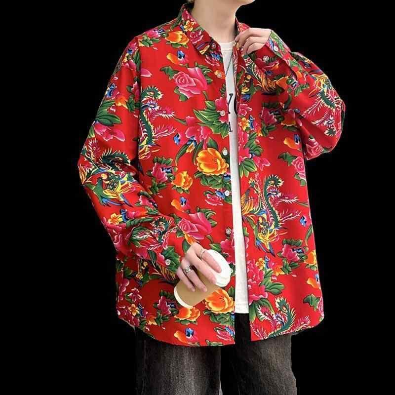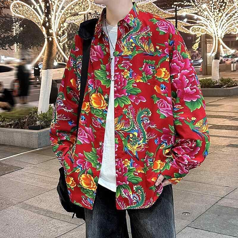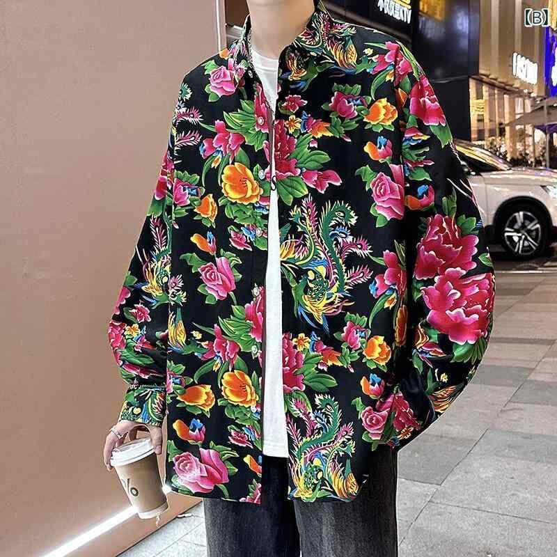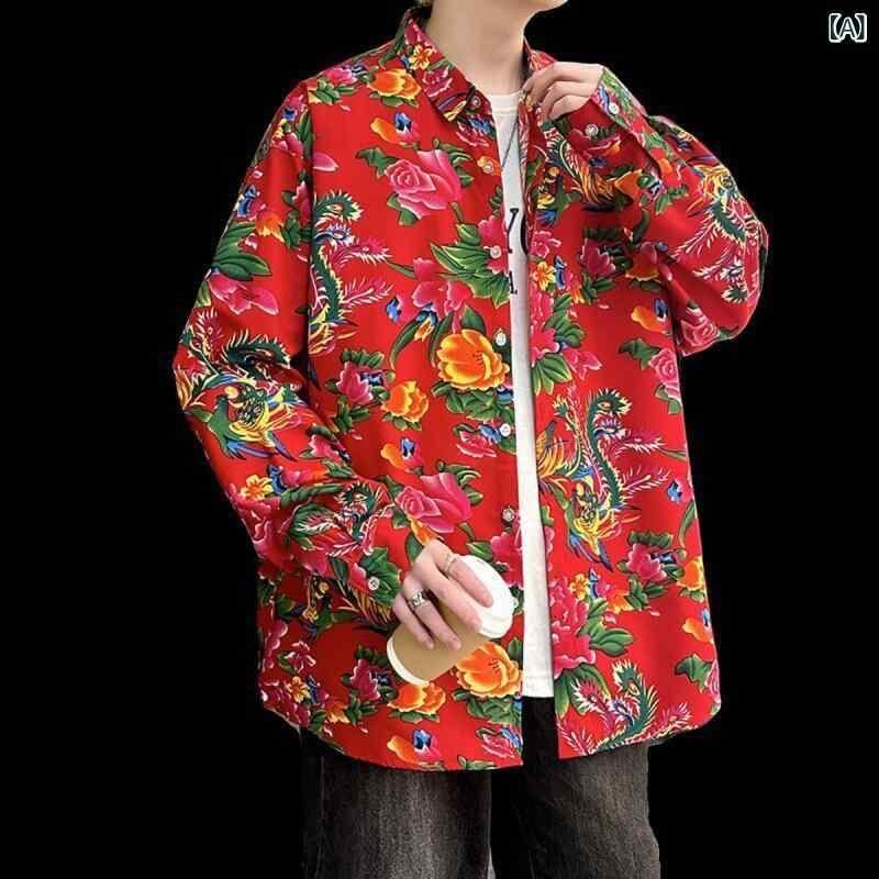 シャツ メンズ 長袖 ゆったり ルーズフィット 大花柄 総柄 カジュアル ストリート トレンド 若者向け ポリエステル ウォッシャブル シワになりにくい 普段着 デイリーユース スタイリッシュ