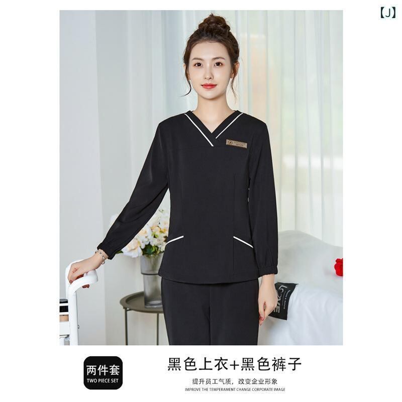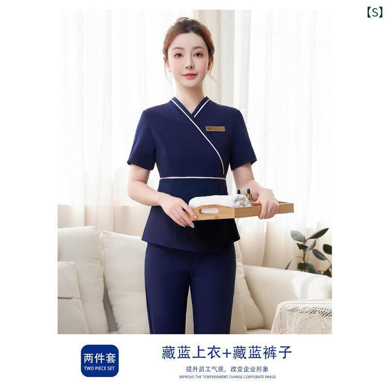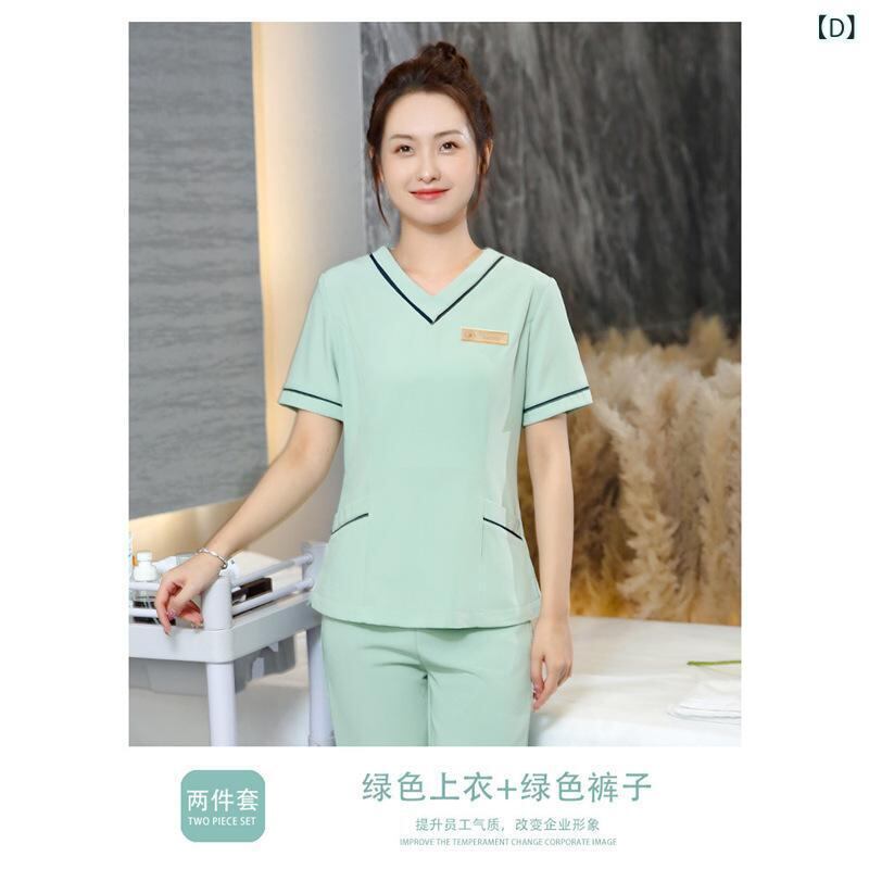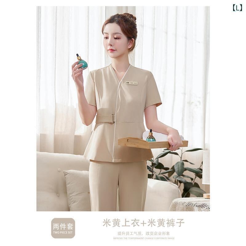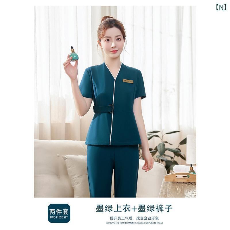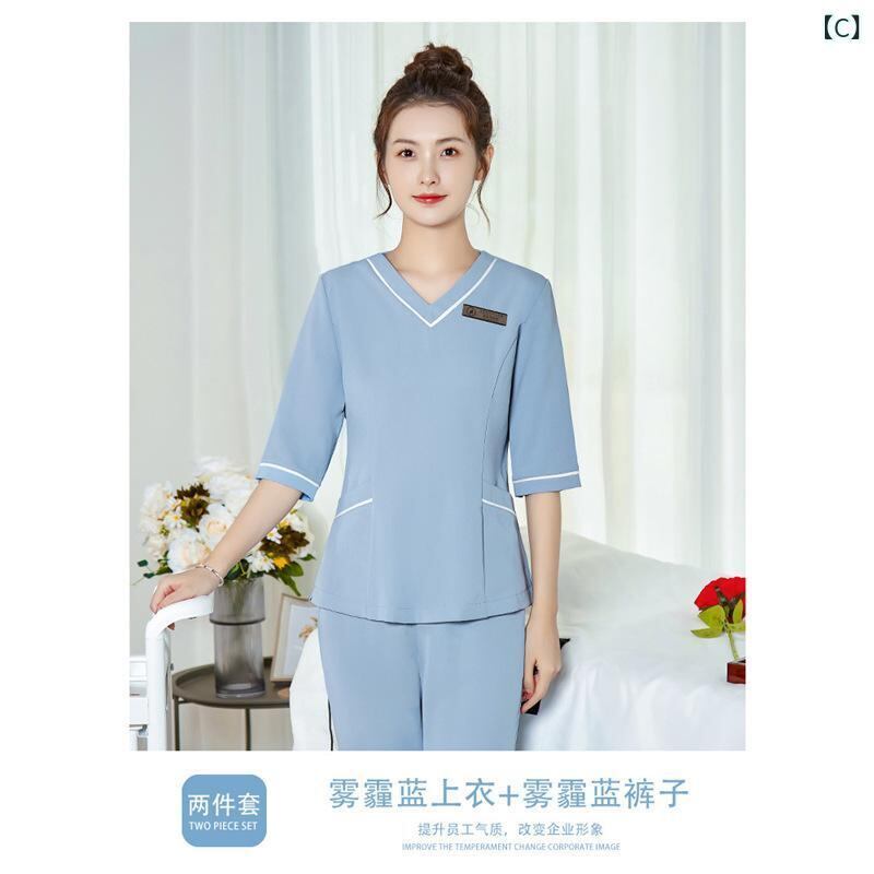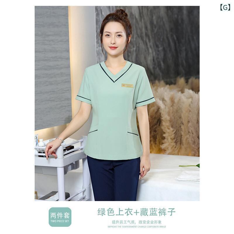 制服 レディース 美容師 エステティシャン ユニフォーム 高級感 上品 ゆったり 五分袖 Vネック セットアップ 吸湿速乾 長パンツ シェニール ポリエステル素材 サロンワーク