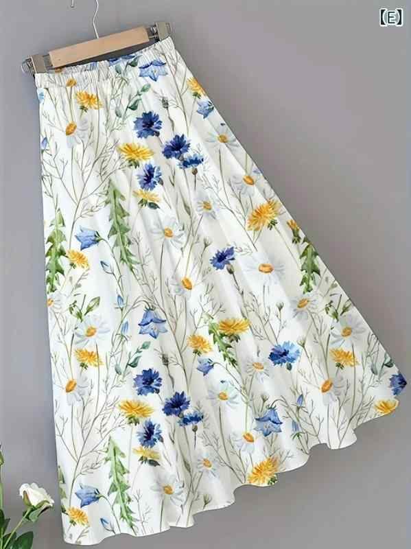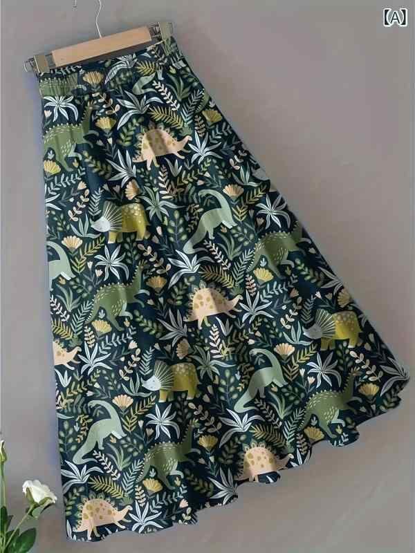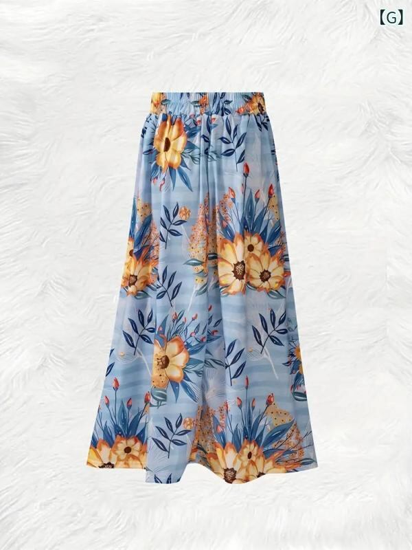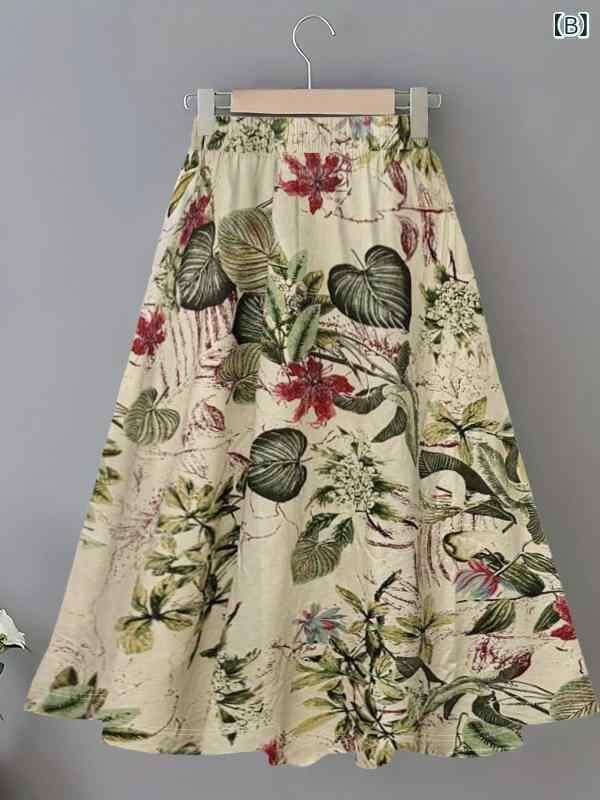 スカート レディース ヒョウ柄 花柄 プリント ウエストゴム Aライン ミディ丈 フレア ポリエステル ストレッチ 伸縮性 ボヘミアン レトロ カジュアル リラックス お洒落 普段使い