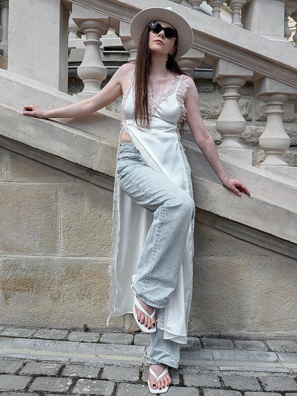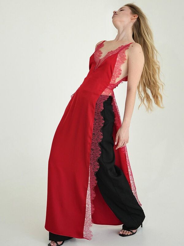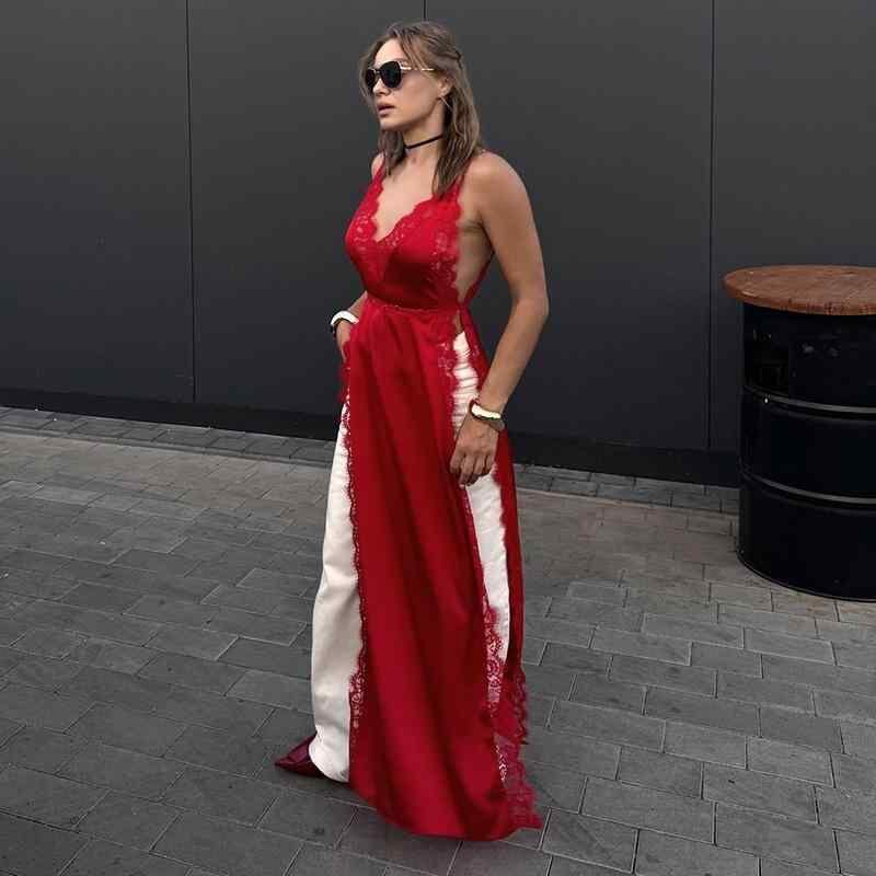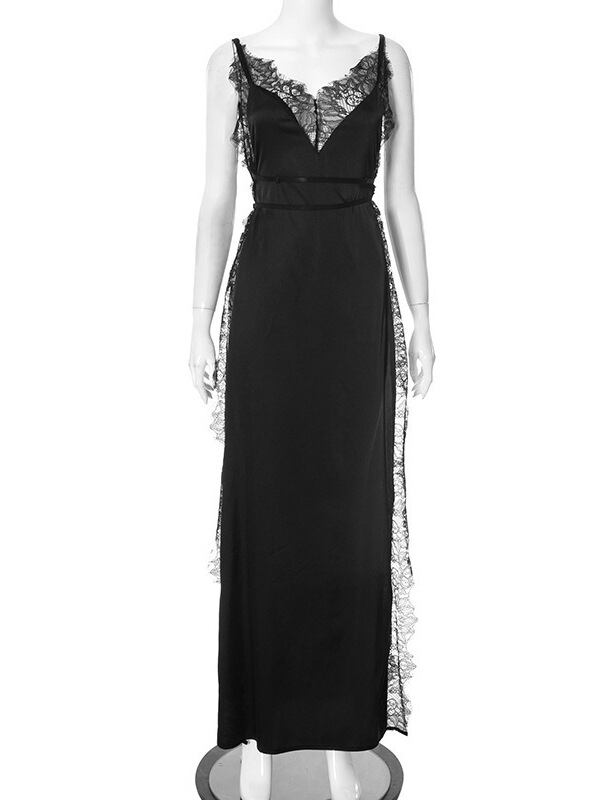 ワンピース レディース 深Vネック バックオープン サイドスリット レーストリム ノースリーブ ハイウエスト タイト ボディコン ロング丈 マキシ丈 エレガント フレンチスタイル 無地 ポリエステル ブラック ホワイト レッド