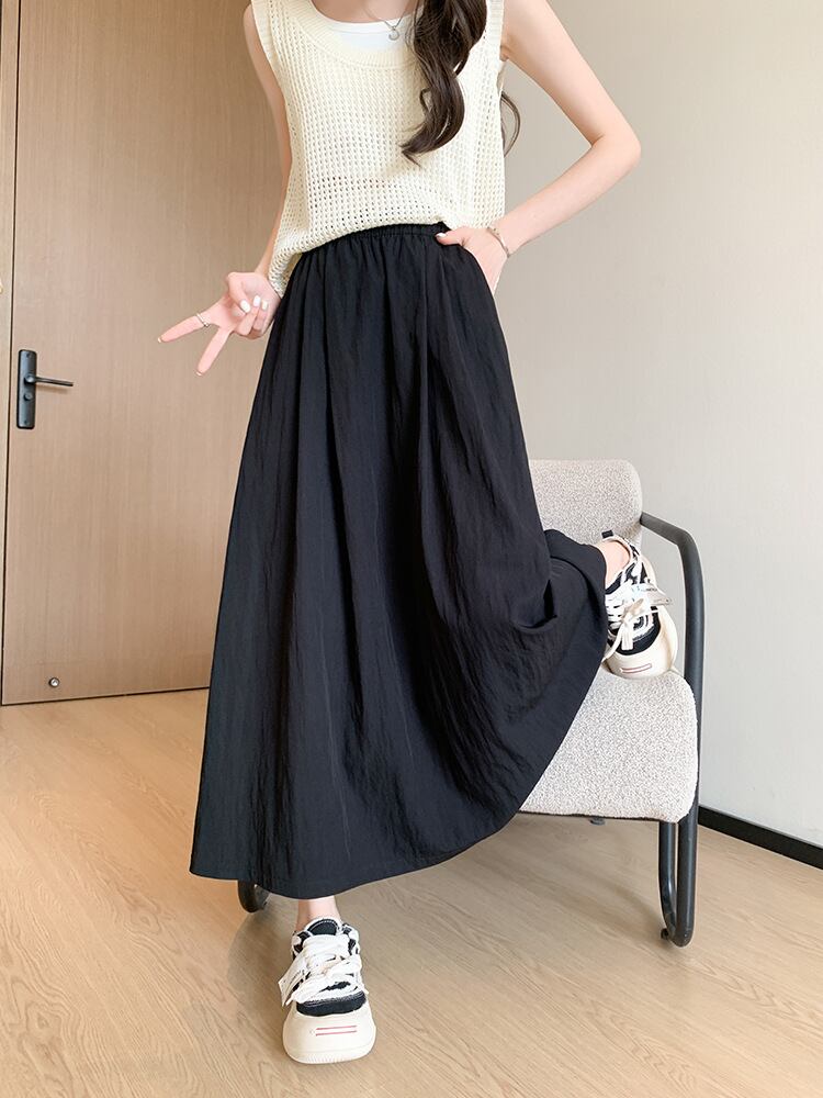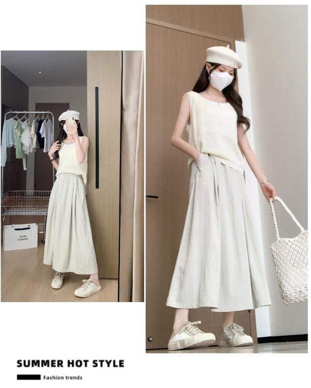 スカート レディース 接触冷感 ハイウエスト 低身長 Aライン フレア ロング ミモレ丈 ドレープ感 とろみ感 ポリエステル ナイロン プリーツ カジュアル リラックススタイル 無地 通勤 普段使い デイリーユース