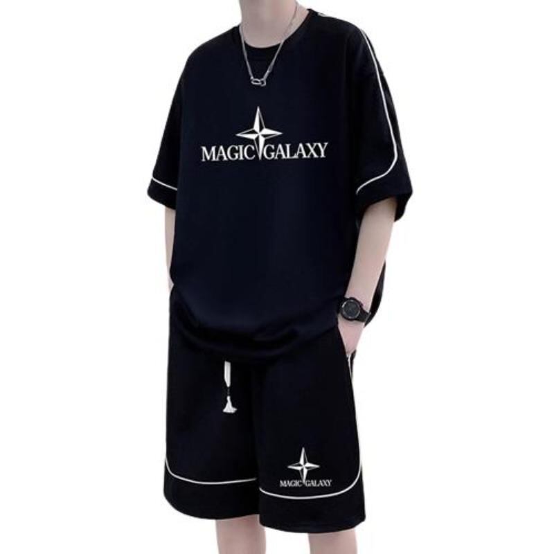 セットアップ メンズ 夏 半袖 Tシャツ ショートパンツ ハーフパンツ ゆったり ビッグシルエット スタイリッシュ スポーツ カジュアル 普段使い リラックス 大きいサイズ 2点セット 綿混紡 ブラック ホワイト グリーン アプリコット