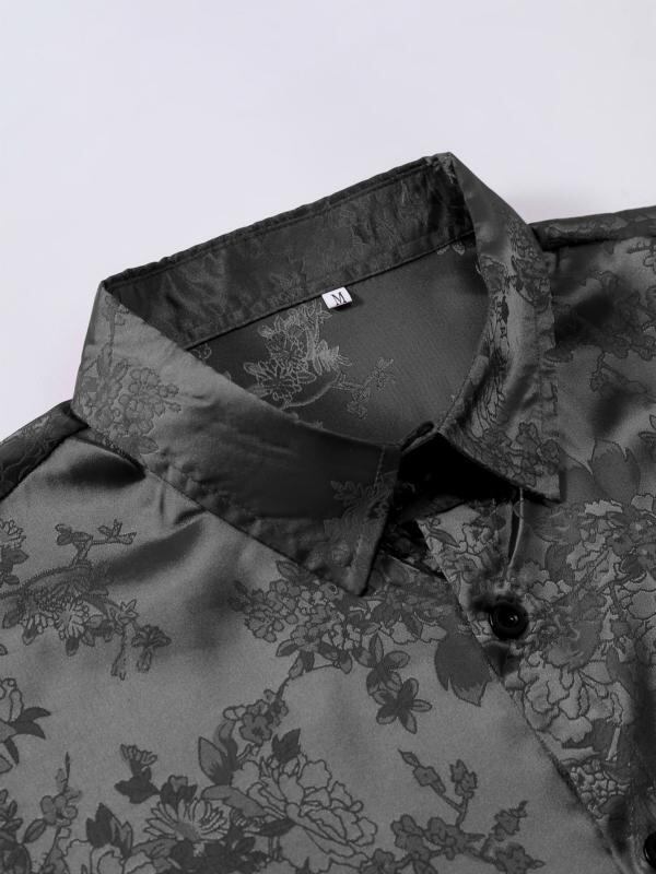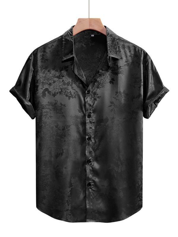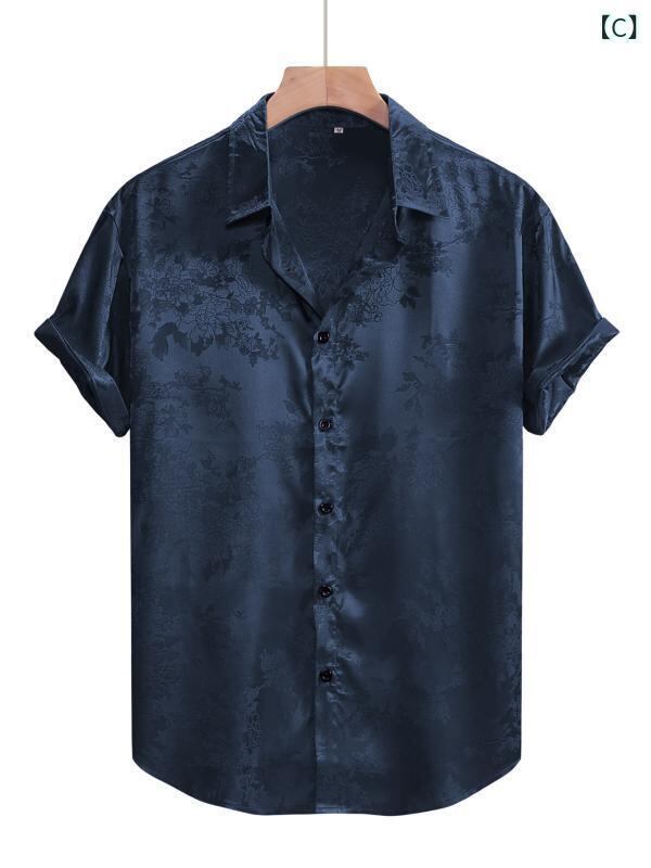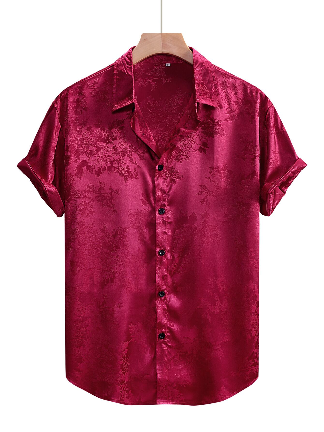 シャツ メンズ 半袖 光沢感 高級感 サテン 花柄 ジャカード織り ボタンシャツ 襟付き スリムフィット ポリエステル素材 ウォッシャブル仕様 パーティー ダンス 舞踏会 フォーマル イベント ブラック ワインレッド ダークネイビー