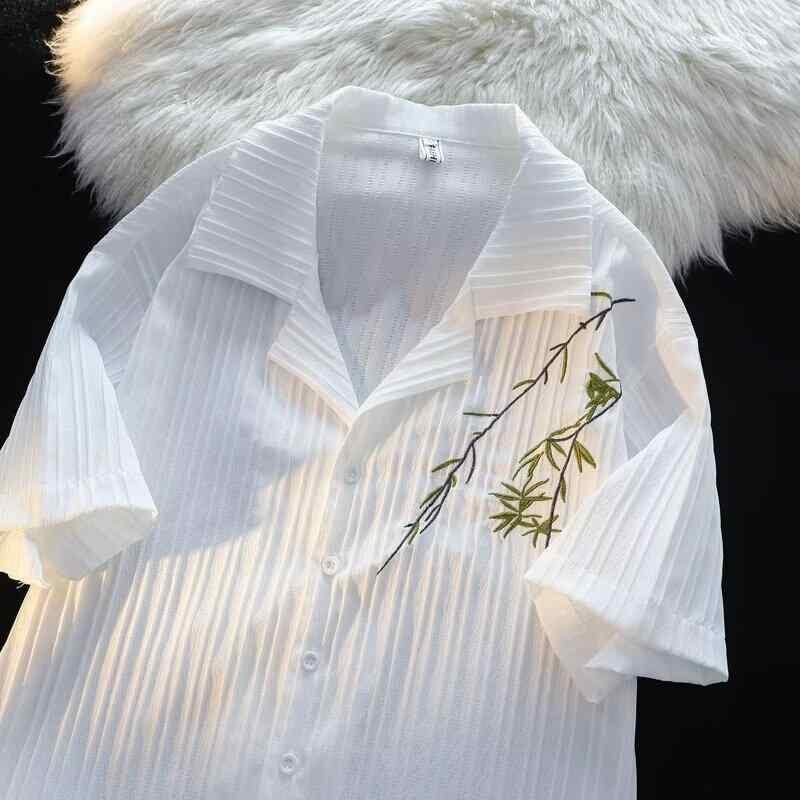 ・カテゴリ: シャツ・スタイル: 青春カジュアル・タイプ: 開襟・主な素材: ポリエステル81-90%・生地名: 化繊混紡・生地番手: 30番手・ネックライン: ラペルカラー・袖丈: 長袖・柄: 植物花柄・厚さ: 普通・フィット: ルーズフィット・デザイン詳細: 刺繍・着用シーン: 日常・シーズン: 夏・対象: 男性・対象年齢: 青少年・加工: ノーアイロン加工・カラー展開: ブラック、ホワイト・サイズ展開: M、L、XL、XXL、XXXL、XXXXL