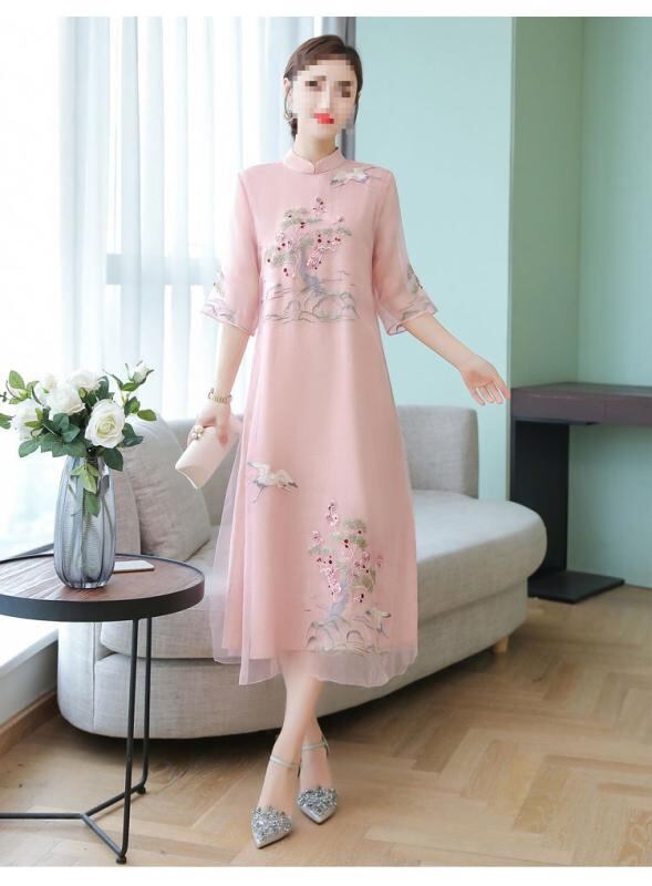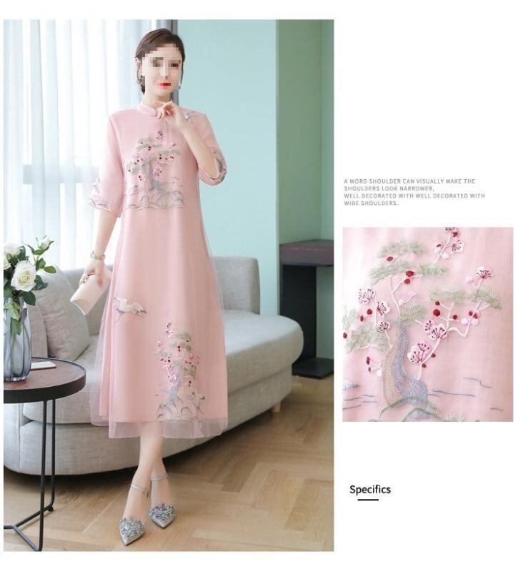 ワンピース レディース 大きいサイズ 体型カバー 改良型チャイナドレス ロング丈 チャイナ風 刺繍 花柄 シフォン Aライン スタンドカラー 七分袖 ゆったり レトロ ピンク グリーン ポリエステル