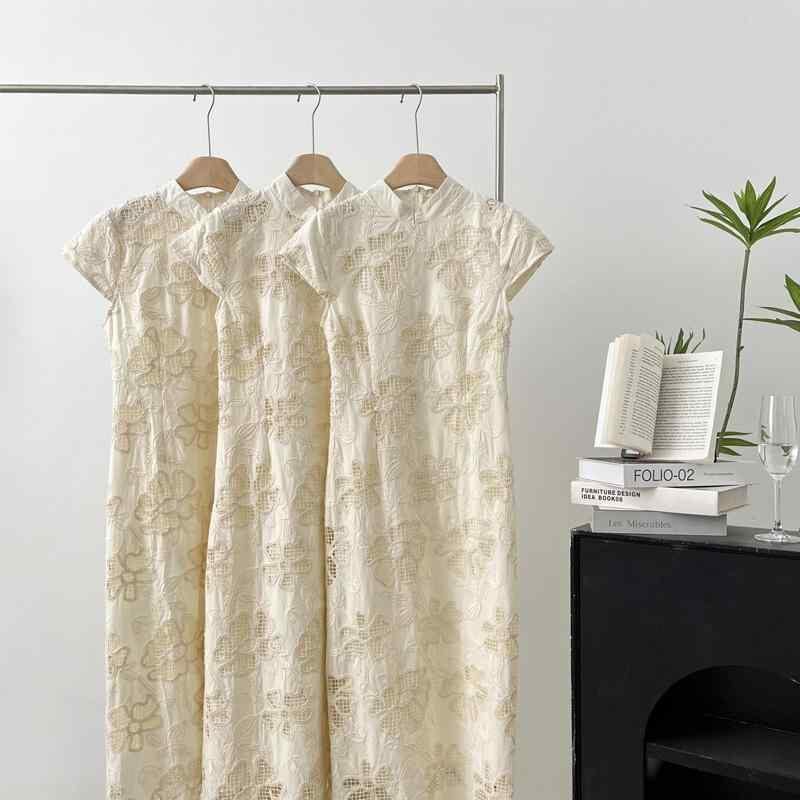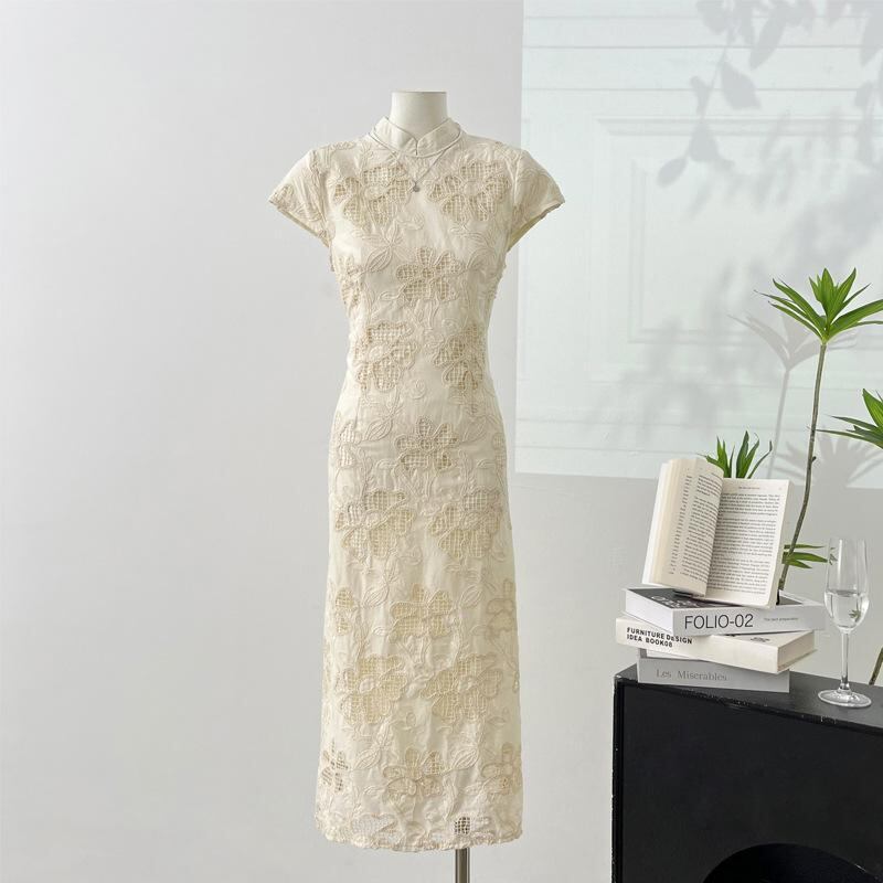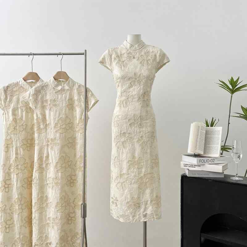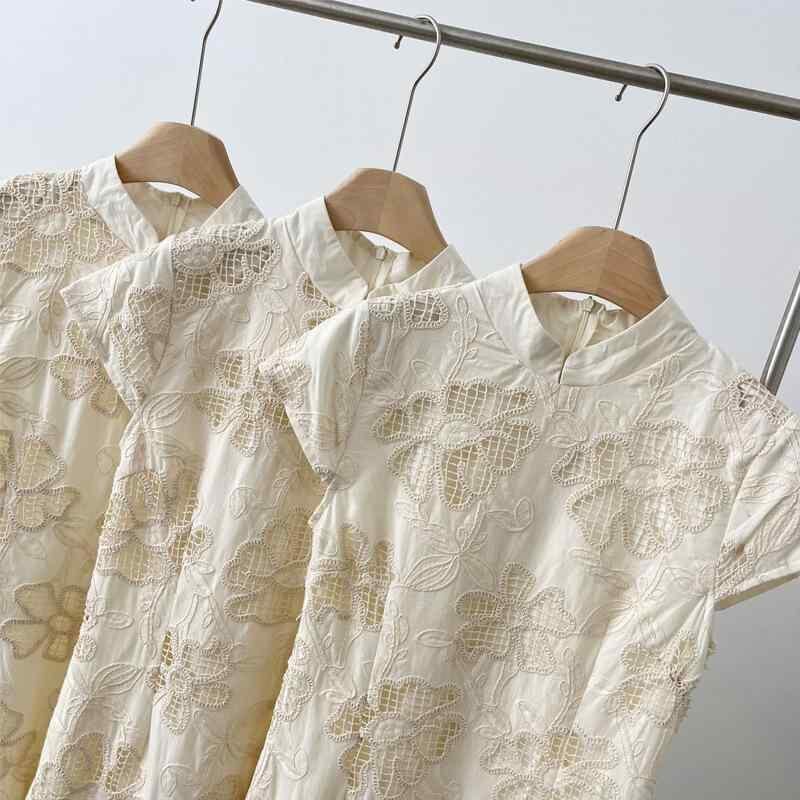 チャイナドレス レディース 改良型 モダン レース チャイナワンピース 中国風 中華風 オフィス 通勤 ミディ丈 半袖 スタンドカラー スリット エレガント 上品 レトロ ポリエステル