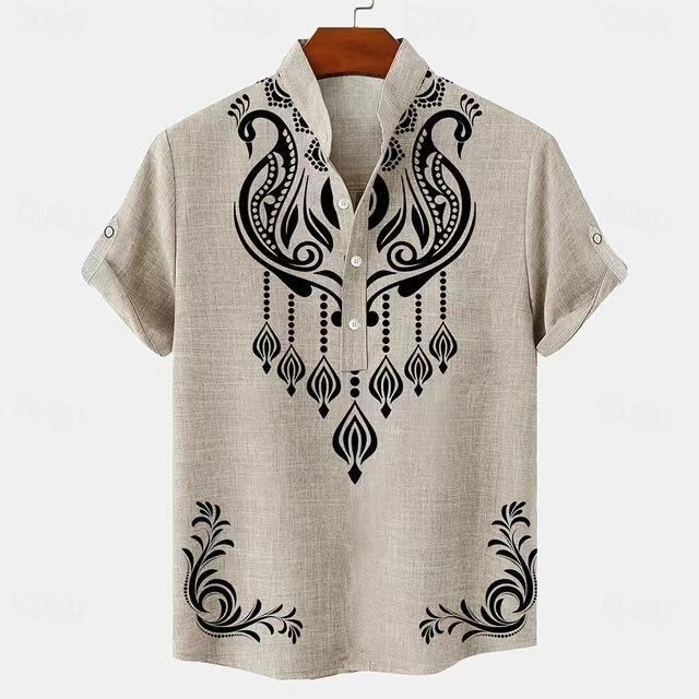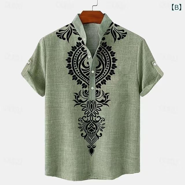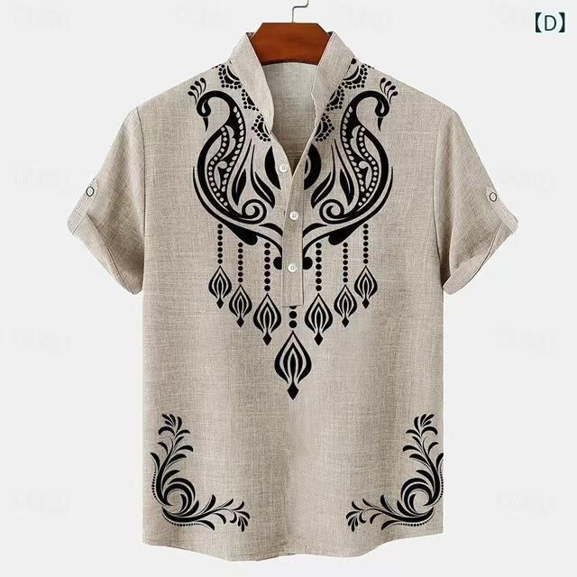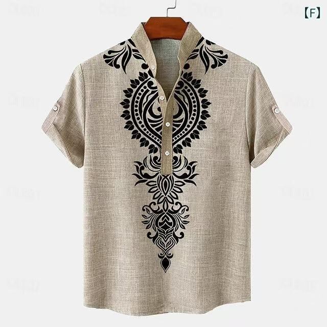 シャツ メンズ ポリエステル リネン調 半袖 カジュアル ゆったり レトロ 3Dグラフィックプリント 柄シャツ シワになりにくい 普段使い 夏用