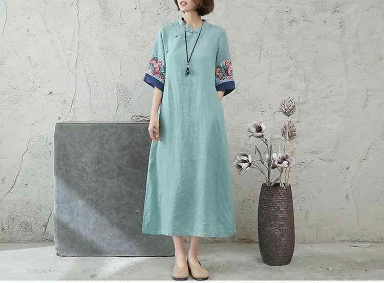 ワンピース レディース 文芸風 レトロ 綿麻 ゆったり 大きいサイズ 高級感 お茶会 民族風 チャイナボタン 刺繍 ロング丈 Aライン 体型カバー 普段使い