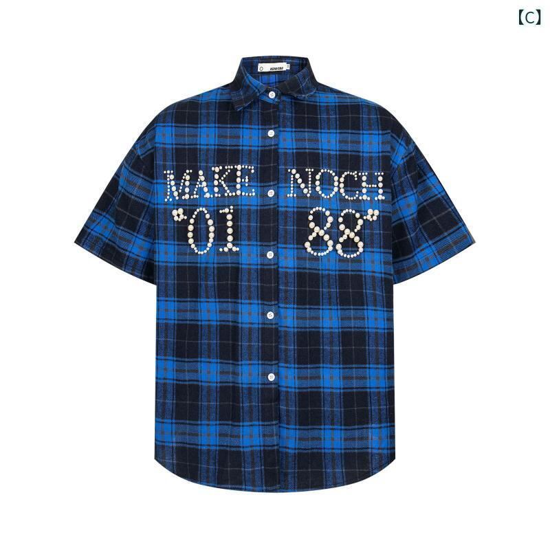 シャツ メンズ 半袖 アメリカンヴィンテージ ハイストリート スタッズ装飾 個性的デザイン 高級感 チェック柄 綿混紡 通気性 イージーケア ルーズフィット 普段使い カジュアル