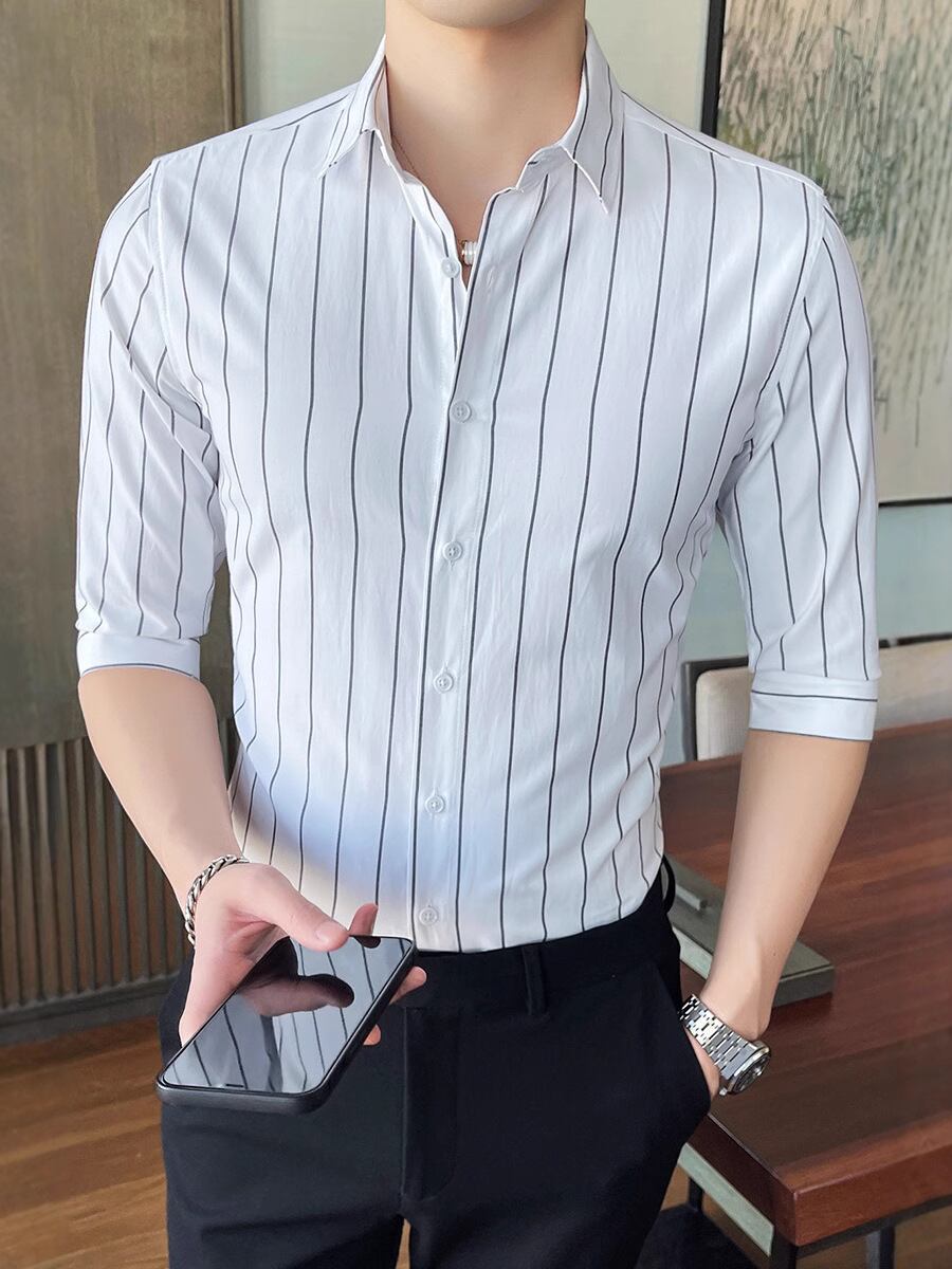 シャツ メンズ ストライプ 七分袖 スリムフィット 綿混 形態安定 イージーケア ビジネス 通勤 オフィス カジュアル 普段使い 高級感 薄手 レギュラーカラー