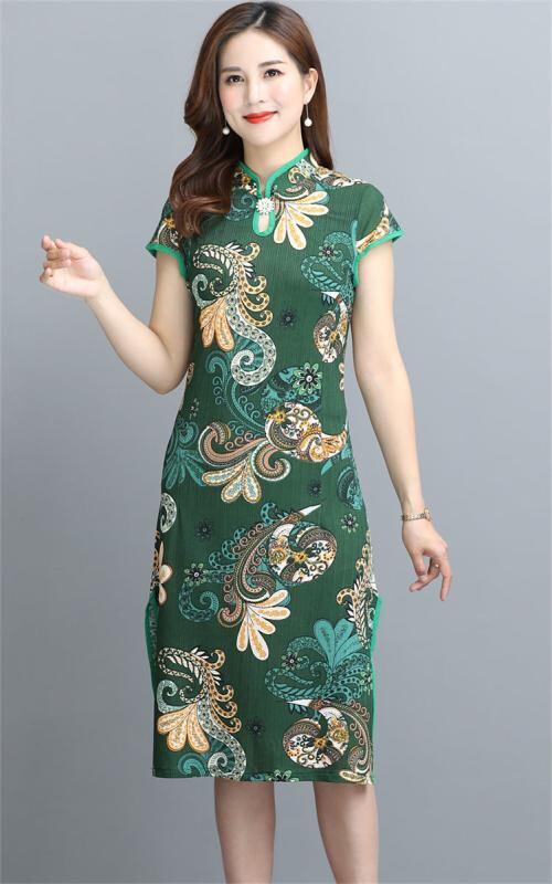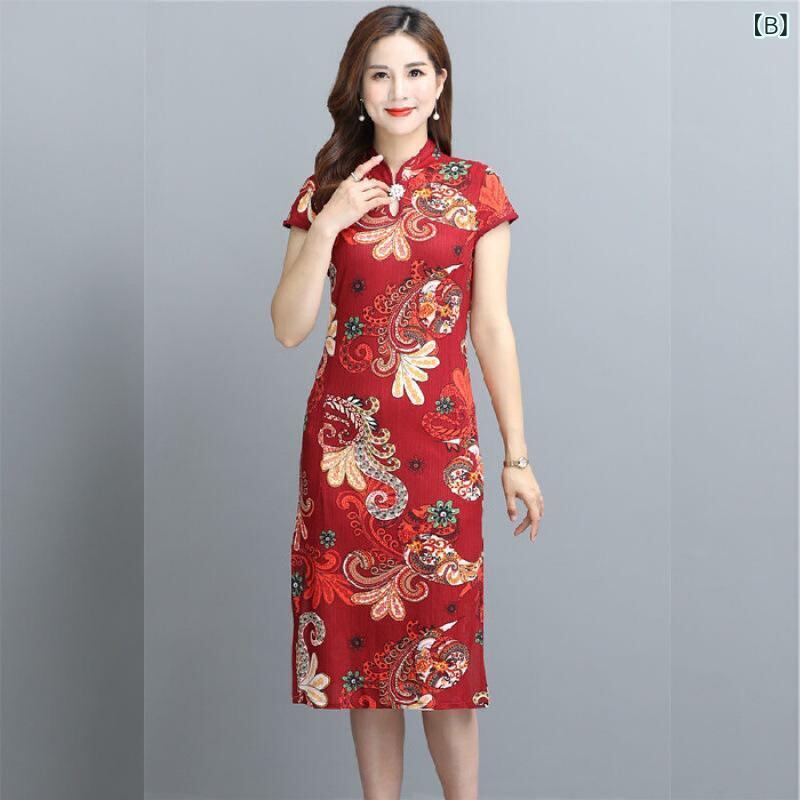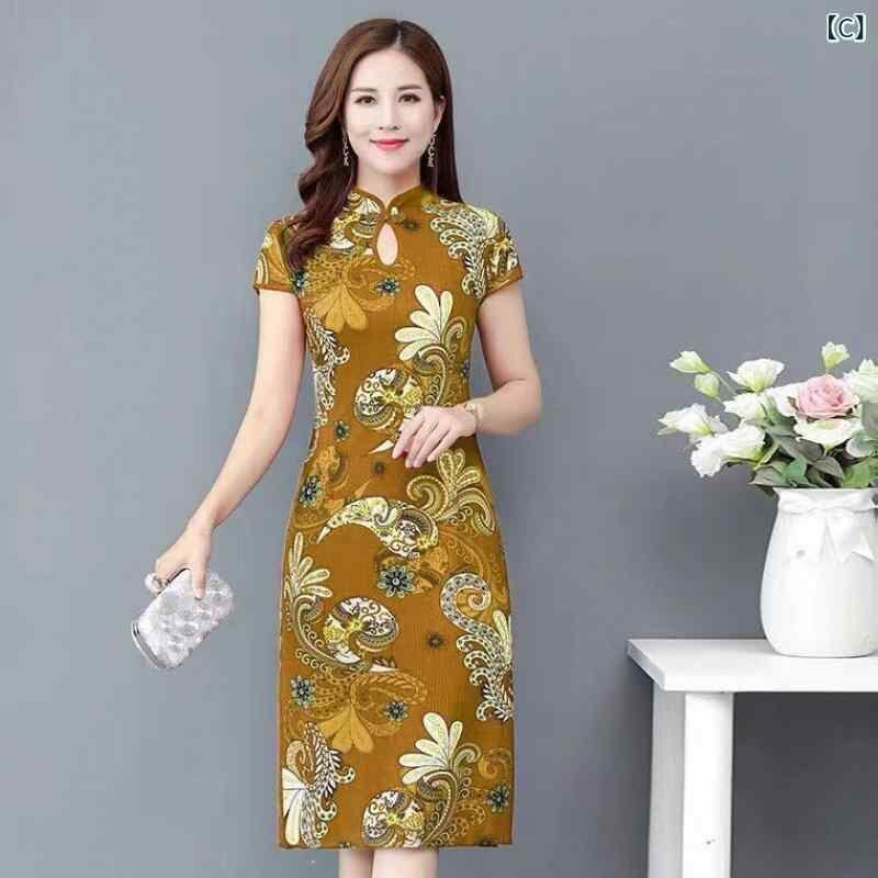 ワンピース レディース 半袖 チャイナドレス チャイナ風ドレス 夏物 中国風 エレガント レトロ ヴィンテージ 花柄プリント ミディ丈 ロング丈