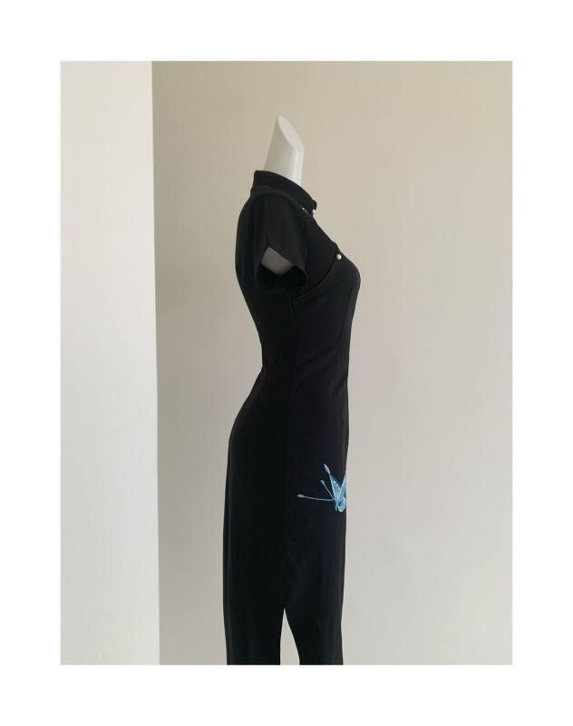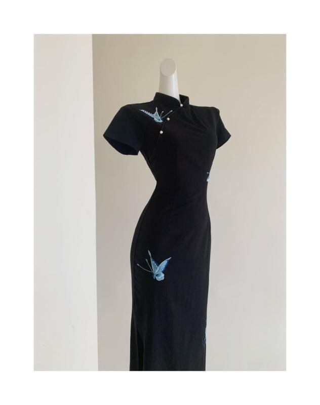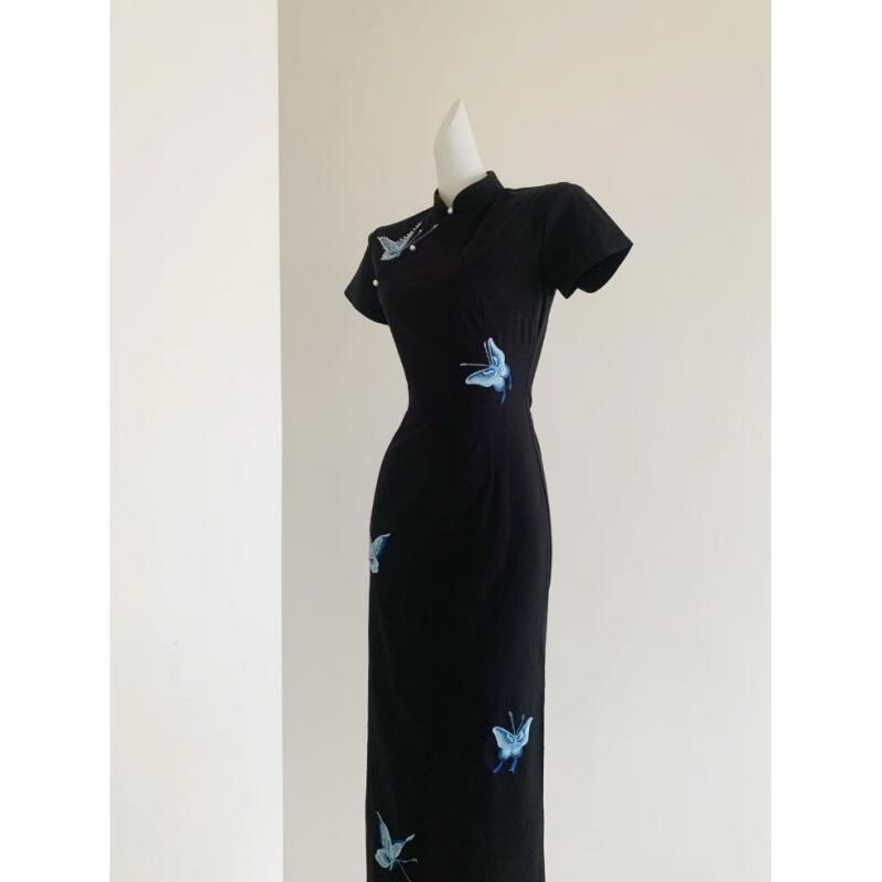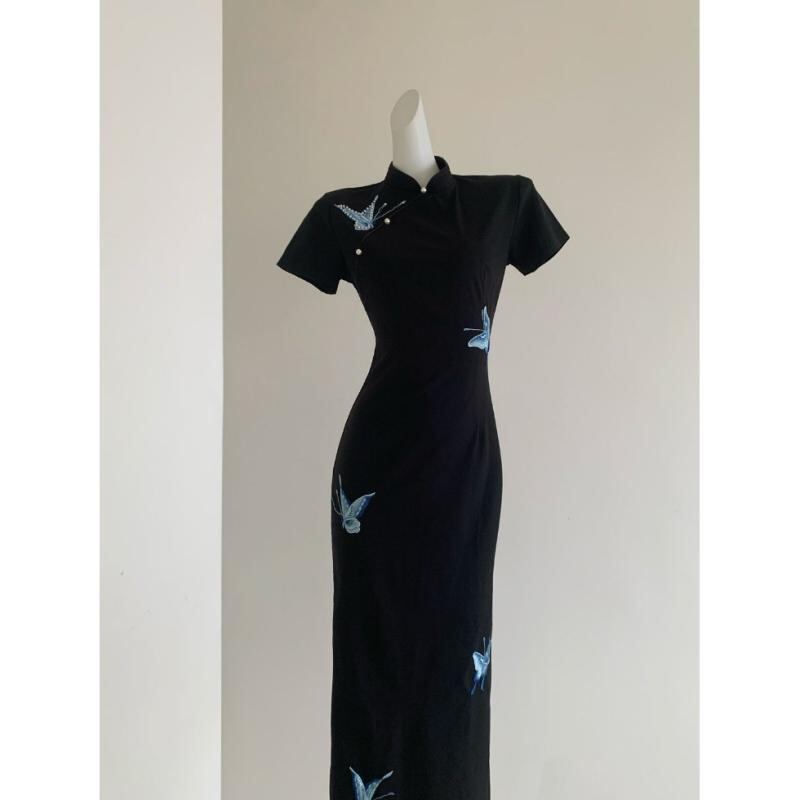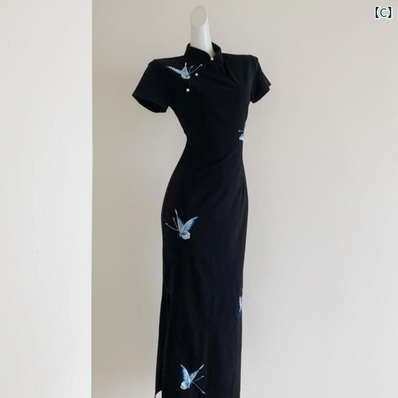 ワンピース レディース 中国風 新中式 改良 旗袍 チャイナドレス 蝶 蝶々 刺繍 スリム フィット ロング丈 エレガント 上品 ラウンドネック スリット 半袖 七分袖 ポリエステル 伸縮性 ブラック 黒 ドレス