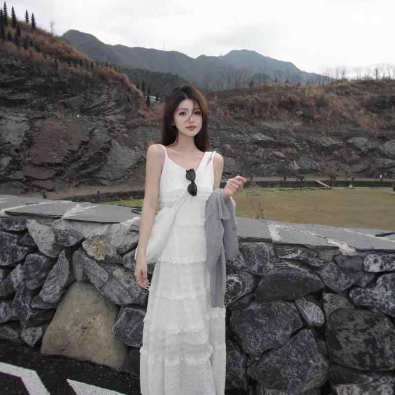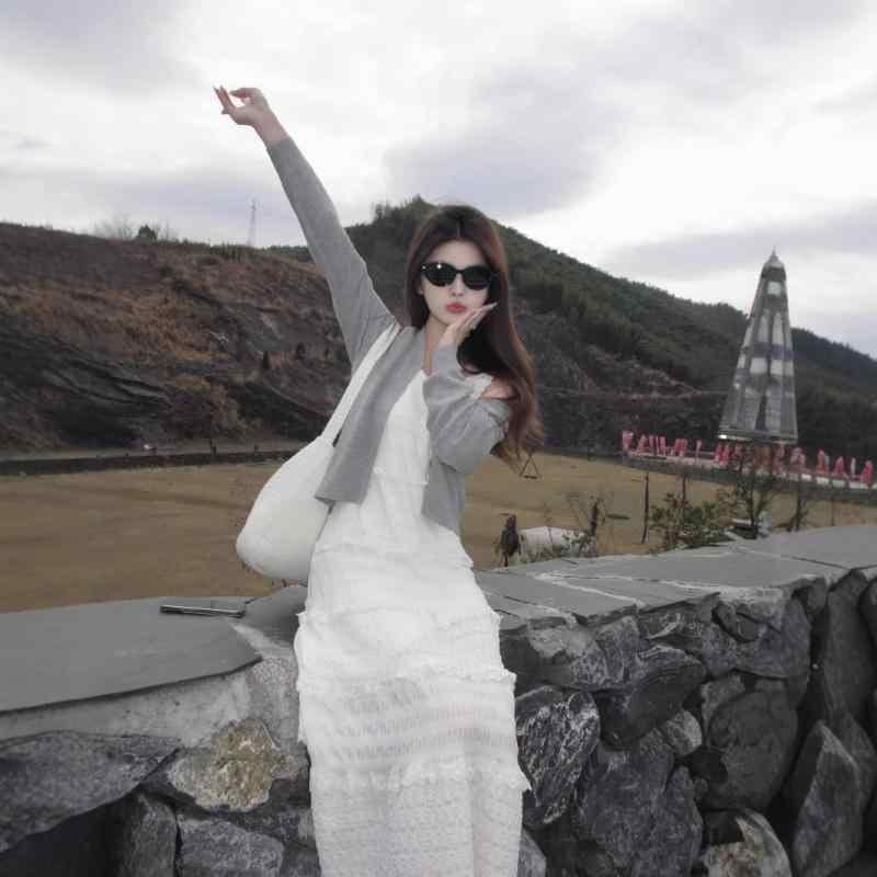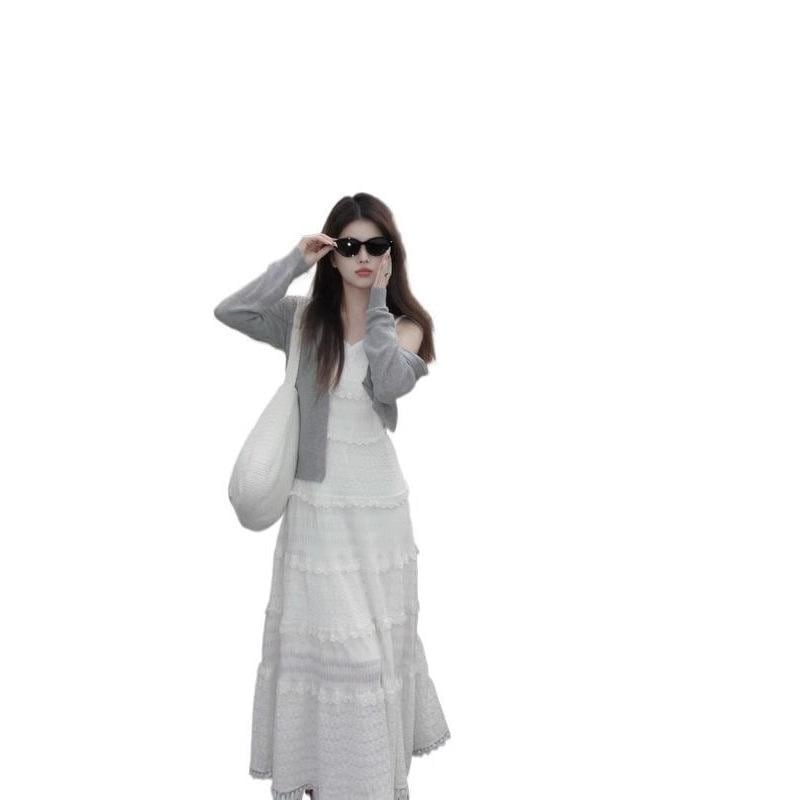 ワンピース アンサンブル レディース 大きいサイズ 夏 レース ティアード キャミドレス 細見え 体型カバー Aライン ハイウエスト ホワイト グレー カーディガン