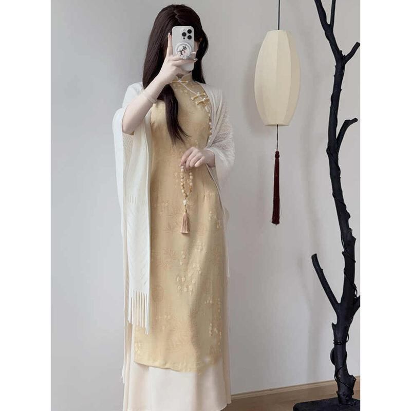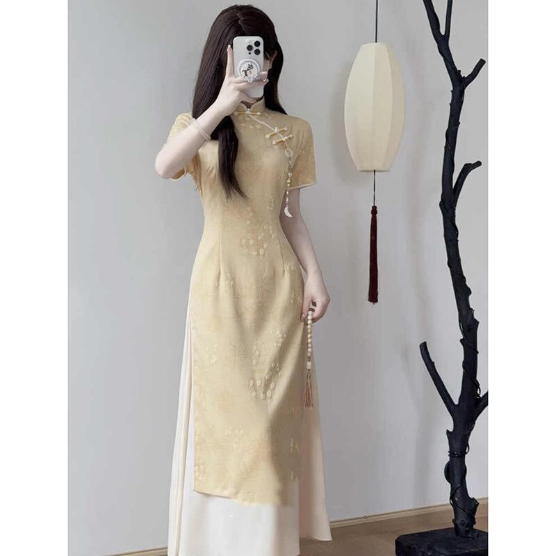チャイナドレス レディース アオザイ風 新中華風 改良版 イエロー ポロ襟 ミドル丈 ノースリーブ エレガント 上品 若々しい 私服 カジュアル シェニール スパンデックス ストレッチ素材