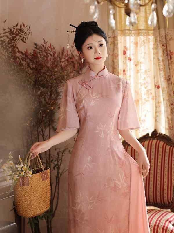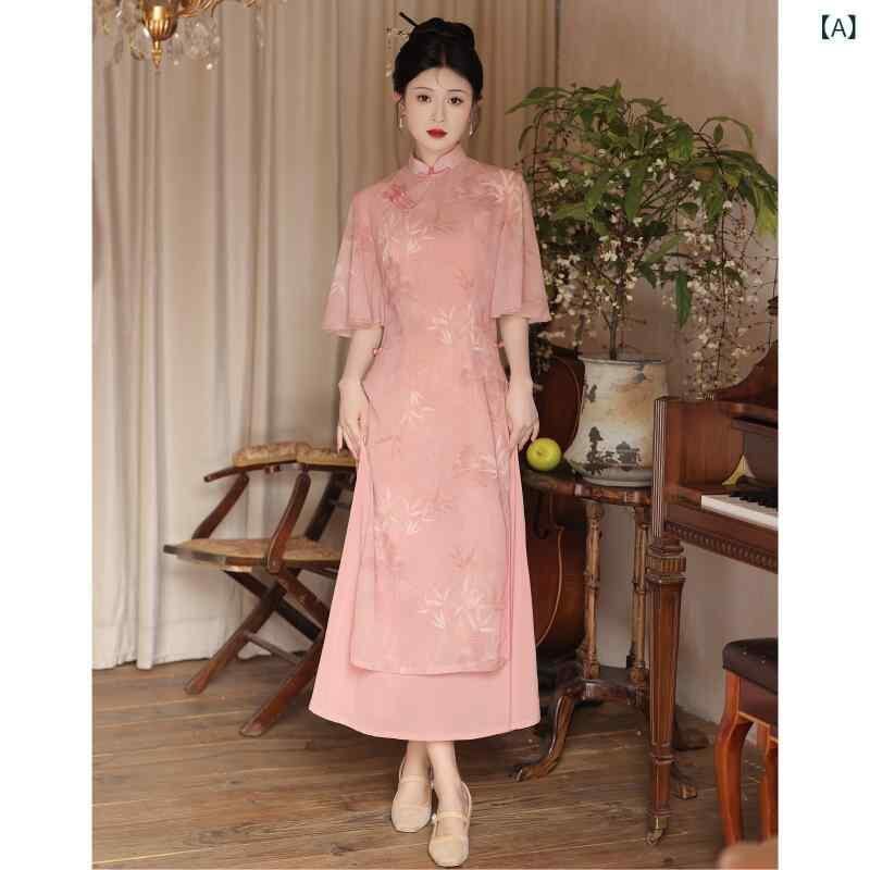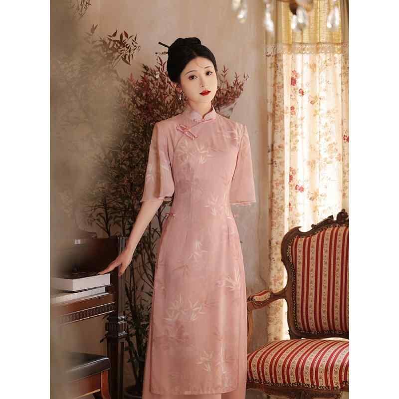 チャイナドレス レディース ピンク 改良 モダン 若々しい 茶会スタイル エレガント 上品 普段使い デイリー ノースリーブ ミドル丈 ポロ襟 シェニール スパンデックス