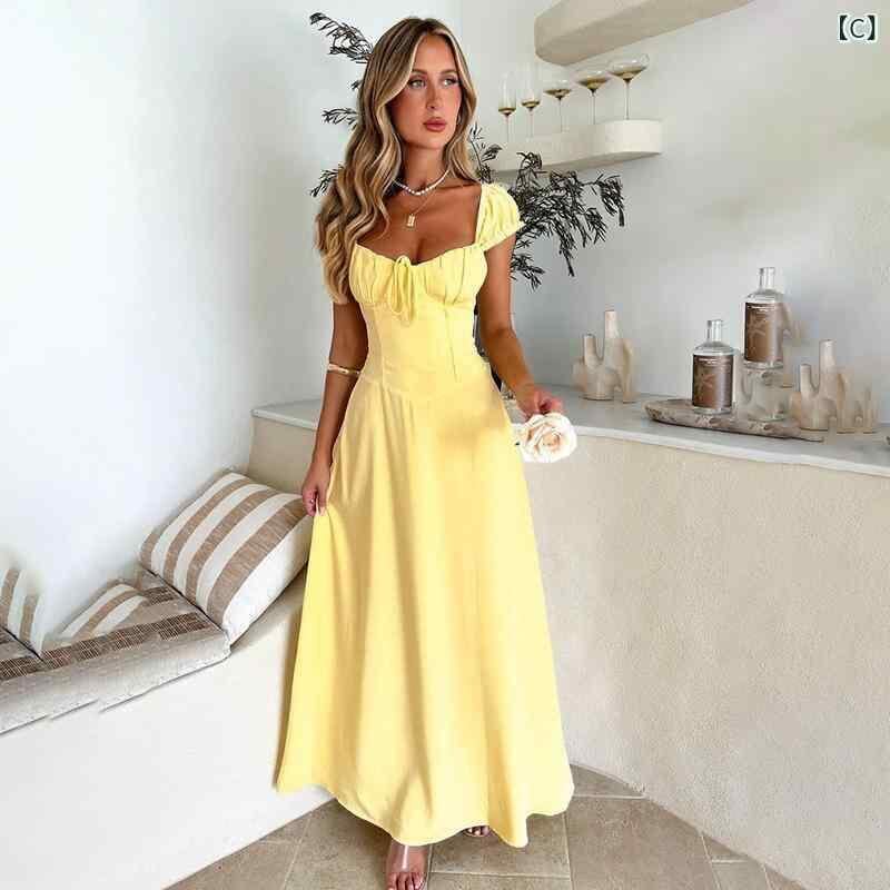 ワンピース レディース レトロ フレンチスタイル スリムフィット ウエストシェイプ 着痩せ効果 スクエアネック 半袖 ハイウエスト ロング丈 タイトシルエット 無地 上品 カジュアル 夏