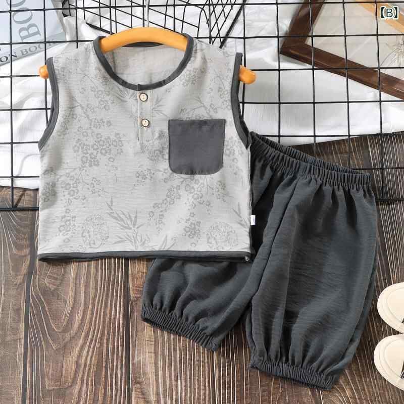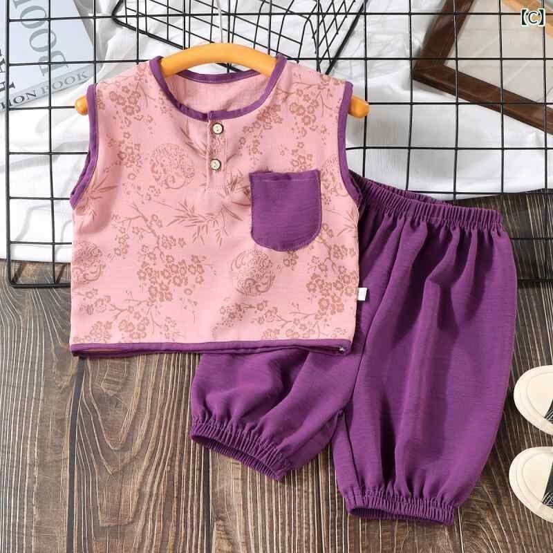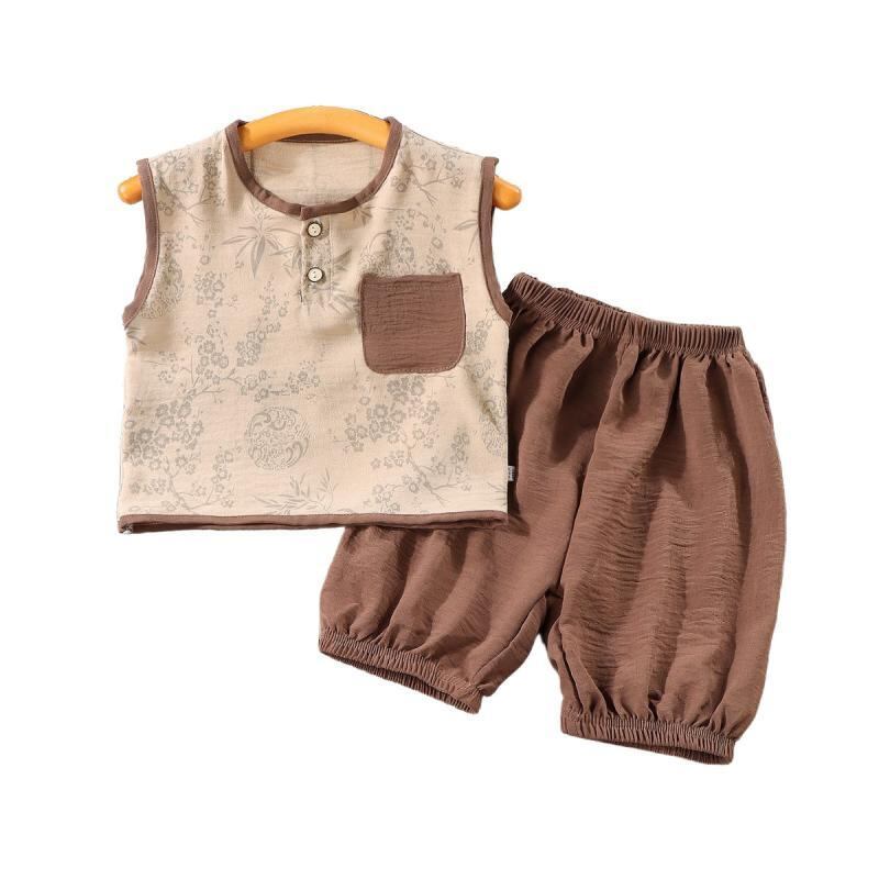 キッズ 男の子 女の子 ノースリーブ ベスト セットアップ レトロ 薄手 夏服 上下セット クロップドパンツ ポリエステル混紡 ゆったり カジュアル ルームウェア 普段使い お出かけ ブラウン グレー パープル