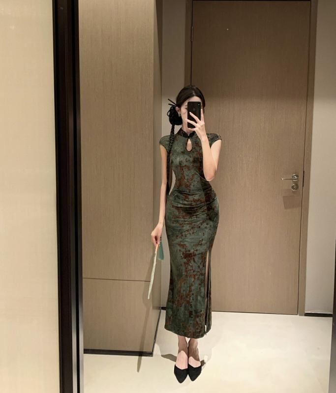 ワンピース レディース 新中国風 改良型 チャイナドレス 旗袍襟 レトロ ヴィンテージ風 花柄プリント 半袖 ミディ丈 タイトシルエット エレガント 上品 セクシー ポリエステル素材 普段使い